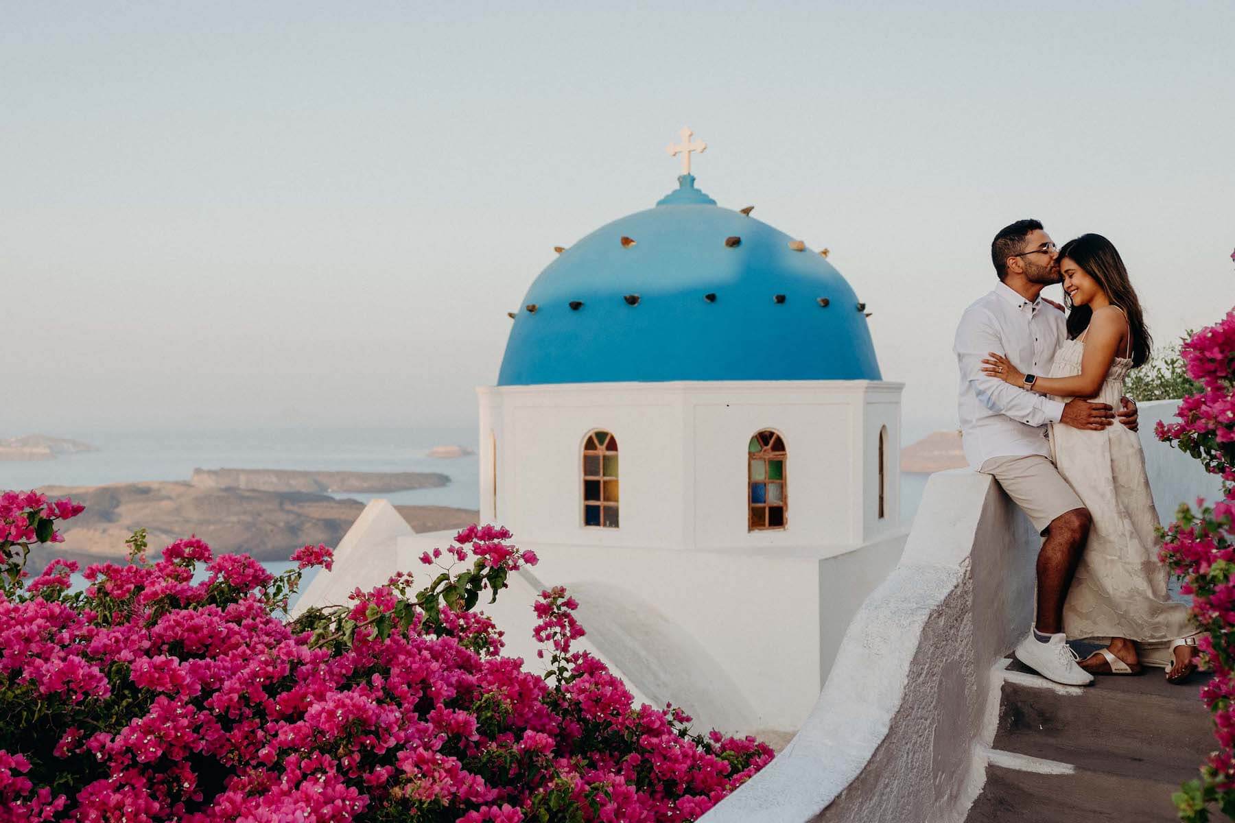 Photo: Spyros in Santorini for Flytographer. Niraj and partner celebrate a proposal in Santorini with a proposal photoshoot in Imerovigli Village.