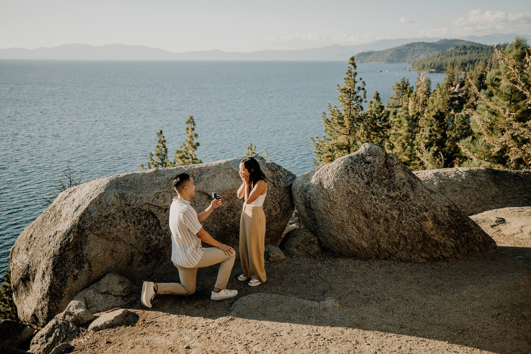 Photo: Josiah in Lake Tahoe for Flytographer. Mark and partner celebrate a proposal in Lake Tahoe with a proposal photoshoot in Logan Shoals.