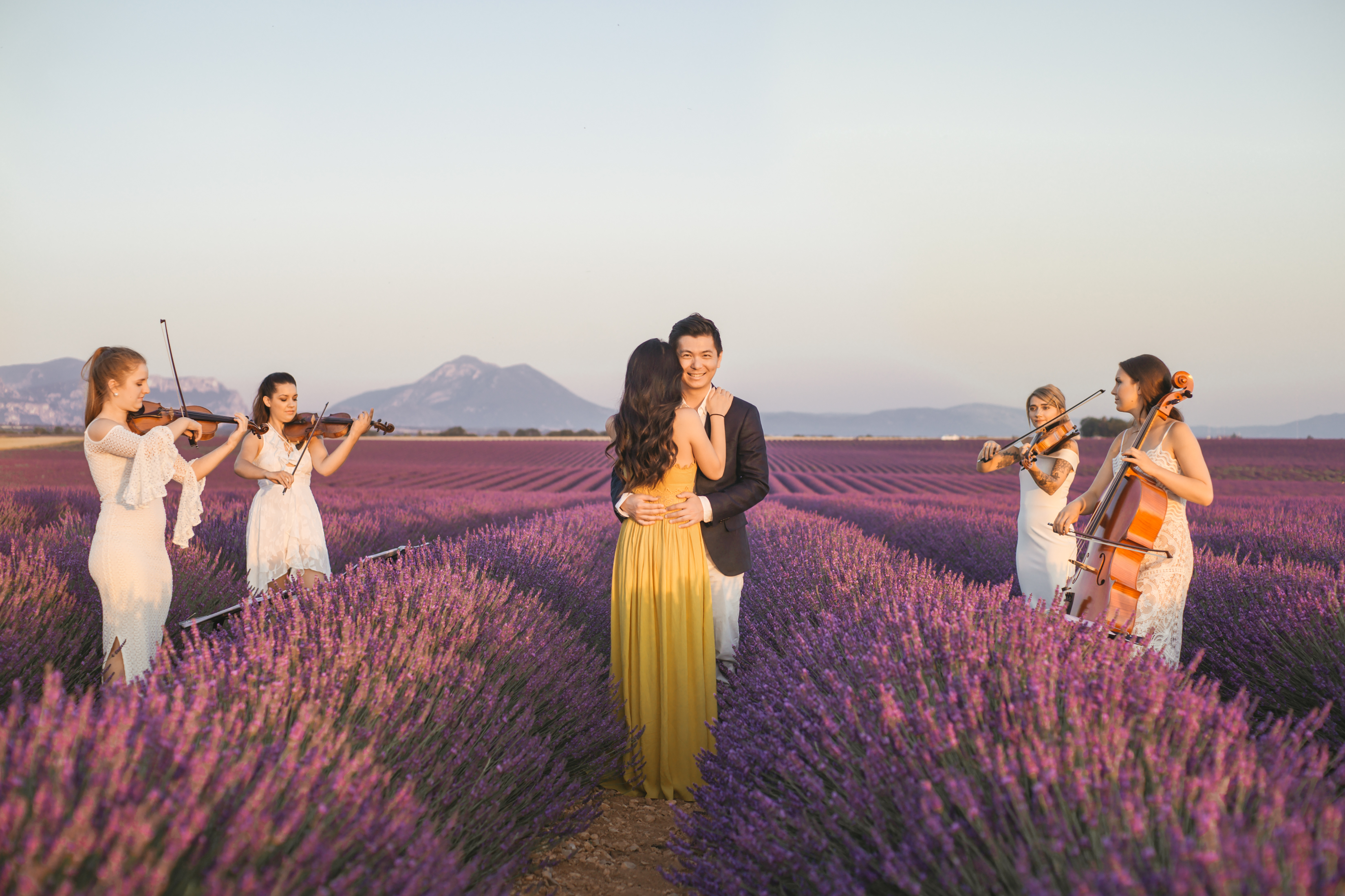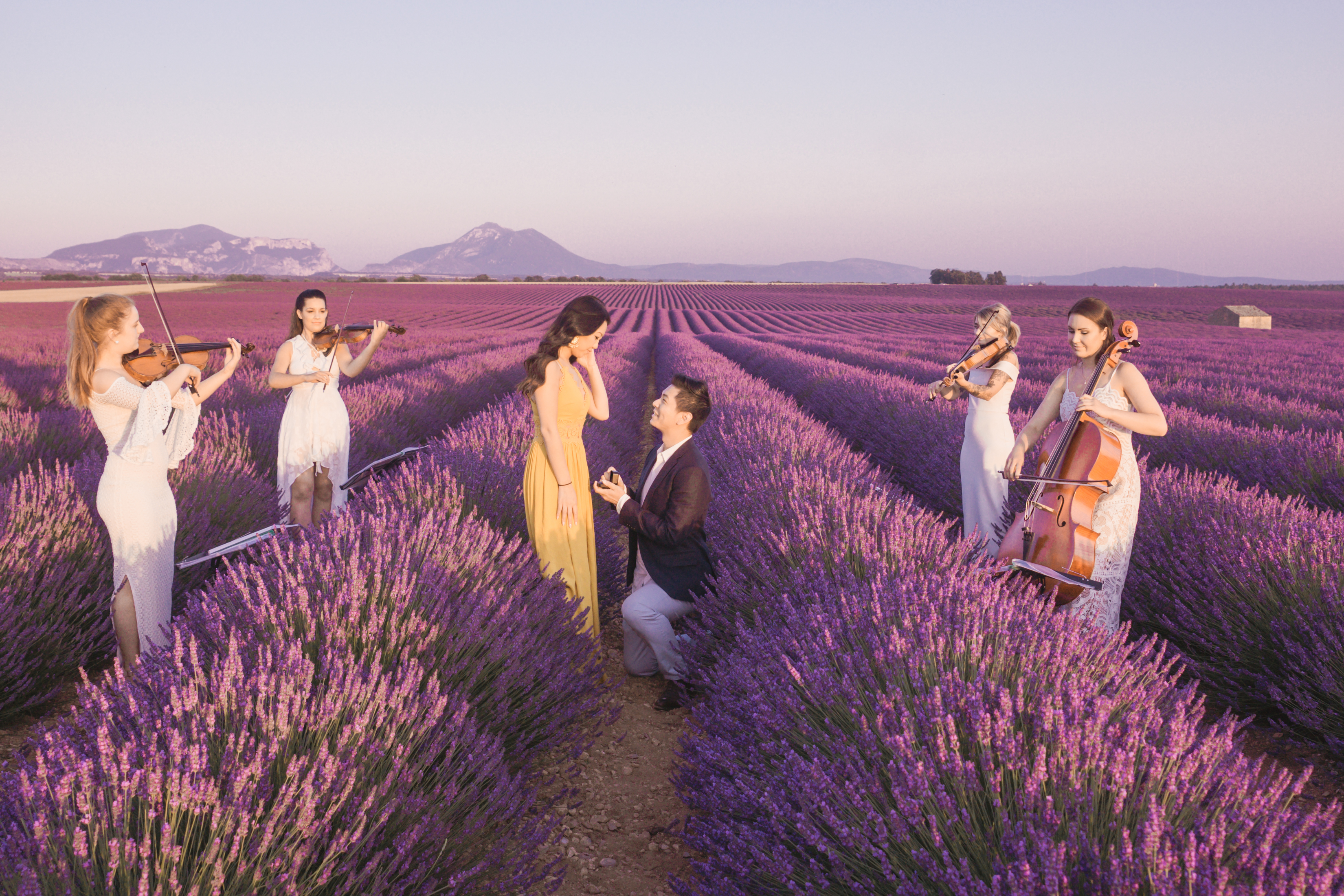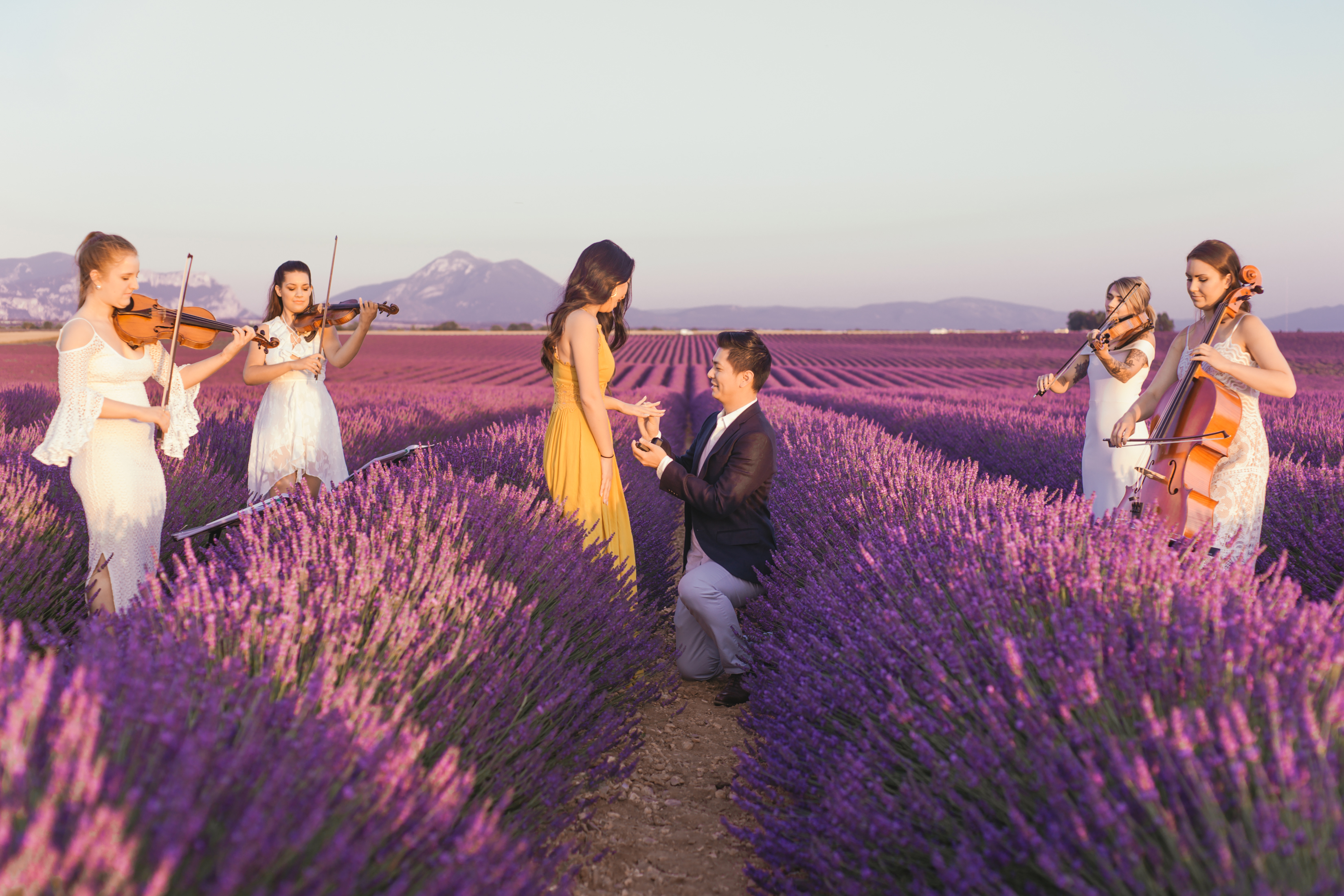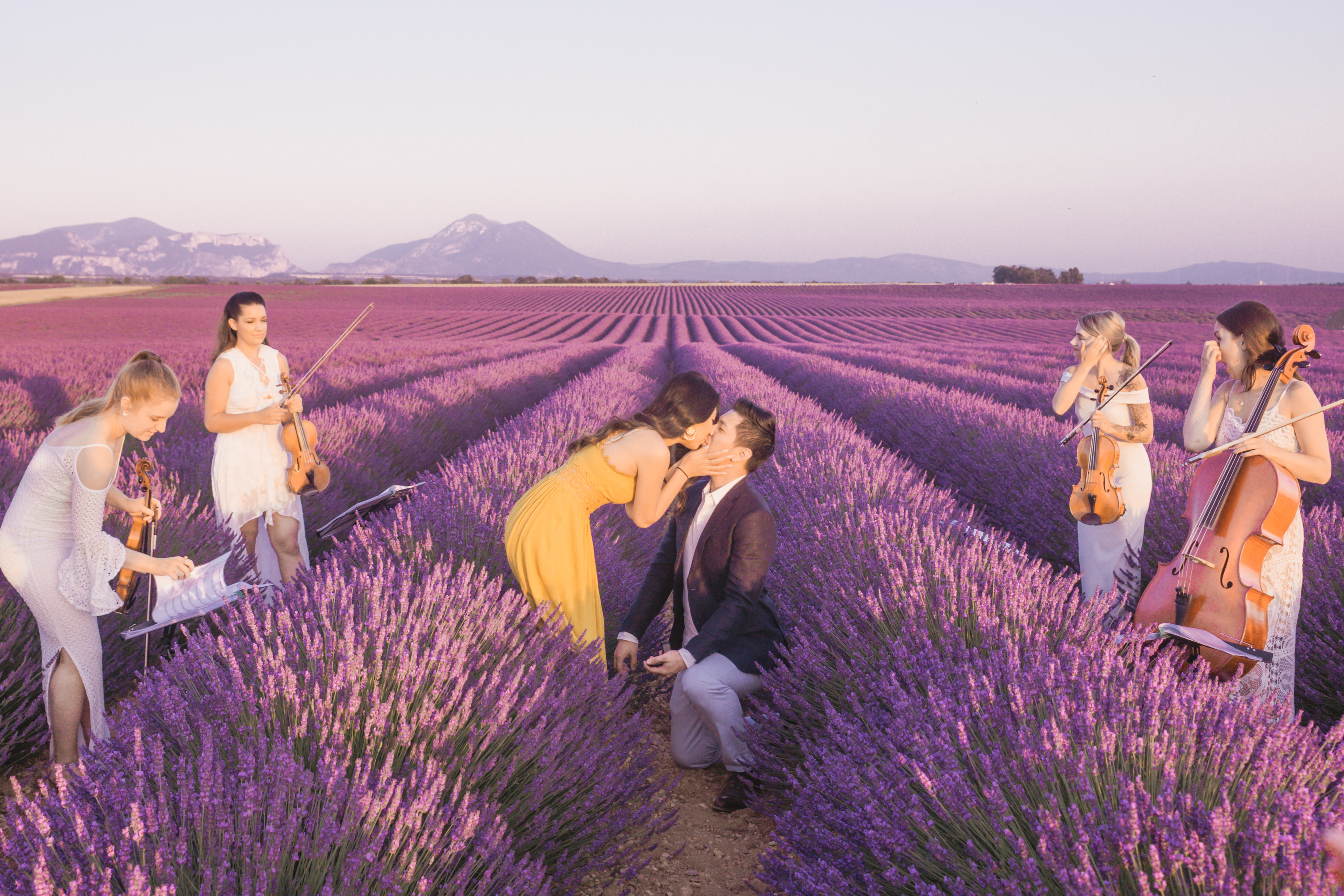 When the day of the ‘photo shoot’ arrived, Flytographer Andrea, Samuel and his unsuspecting girlfriend met up as planned and they started taking pictures as they made their way towards the lavender. Not far away, among the rows of breathtaking lavender, Flytographer Cyril, was there waiting with the string quartet. As they got closer to the string quartet, Andrea suggested that they get their picture taken with the musicians. So as she snaps away, they all of a sudden begin to play the couple’s favourite song and next thing you know, Samuel was down on one knee. Her answer? She said yes of course!