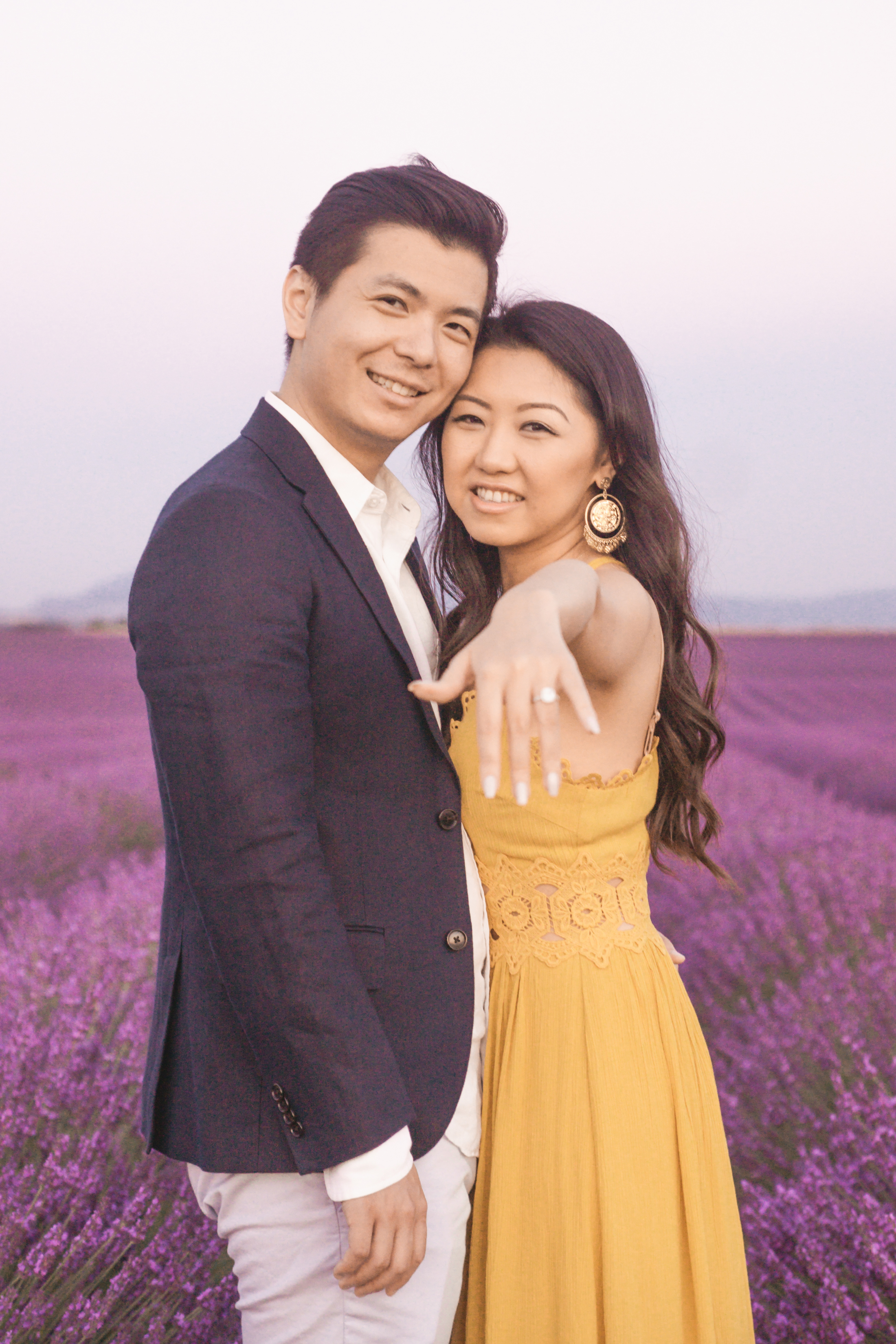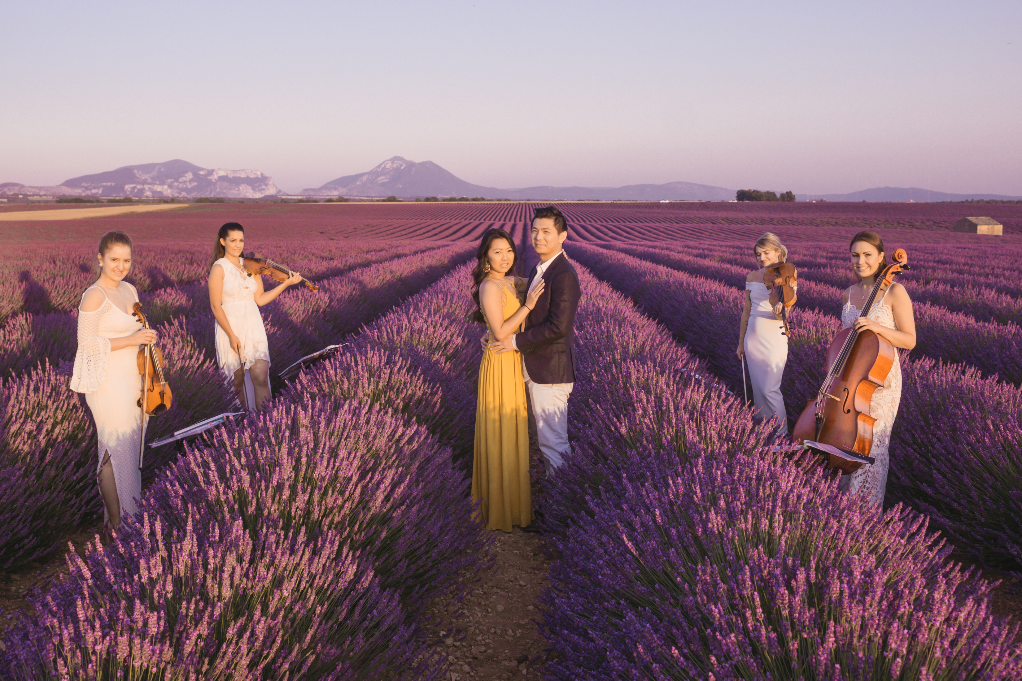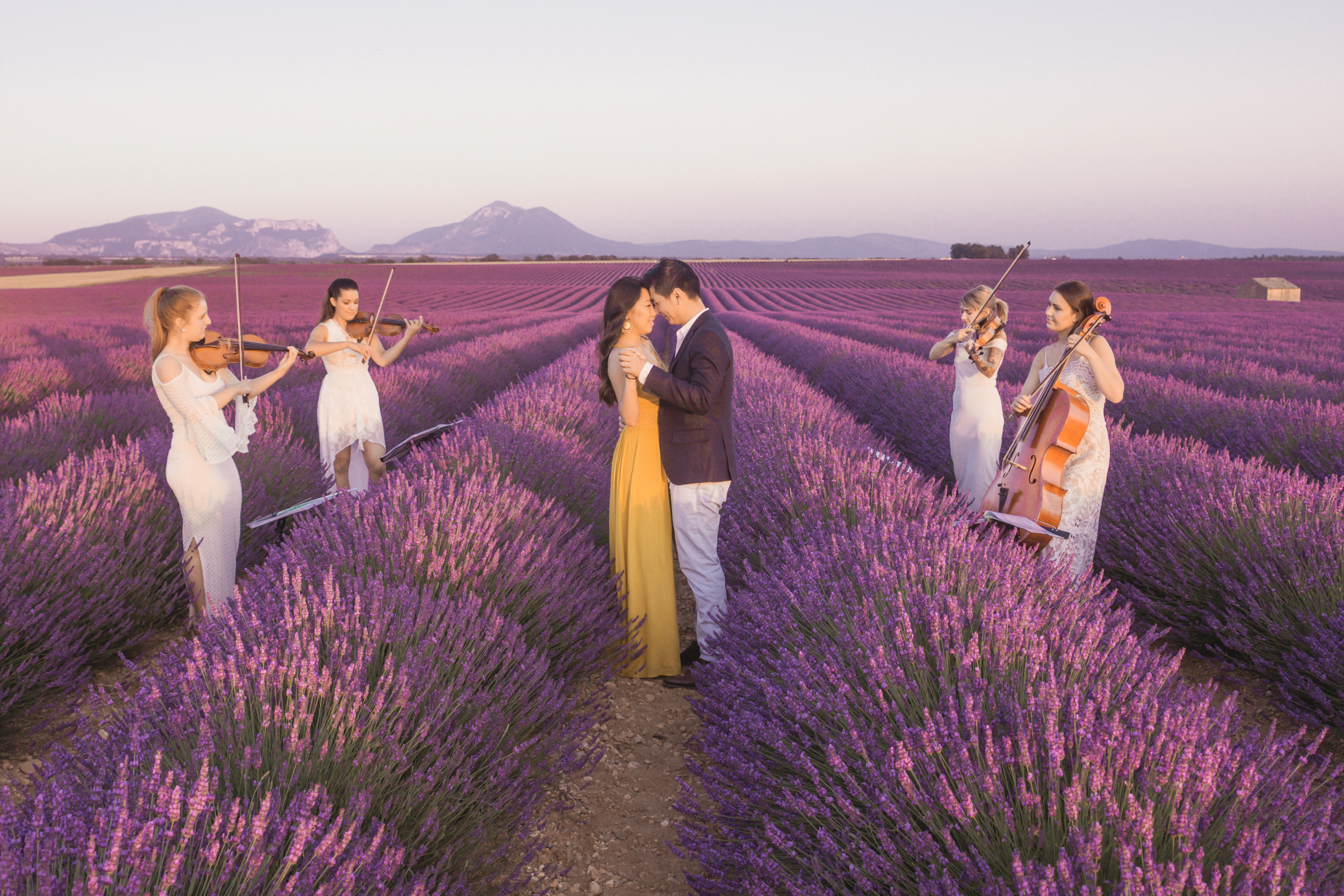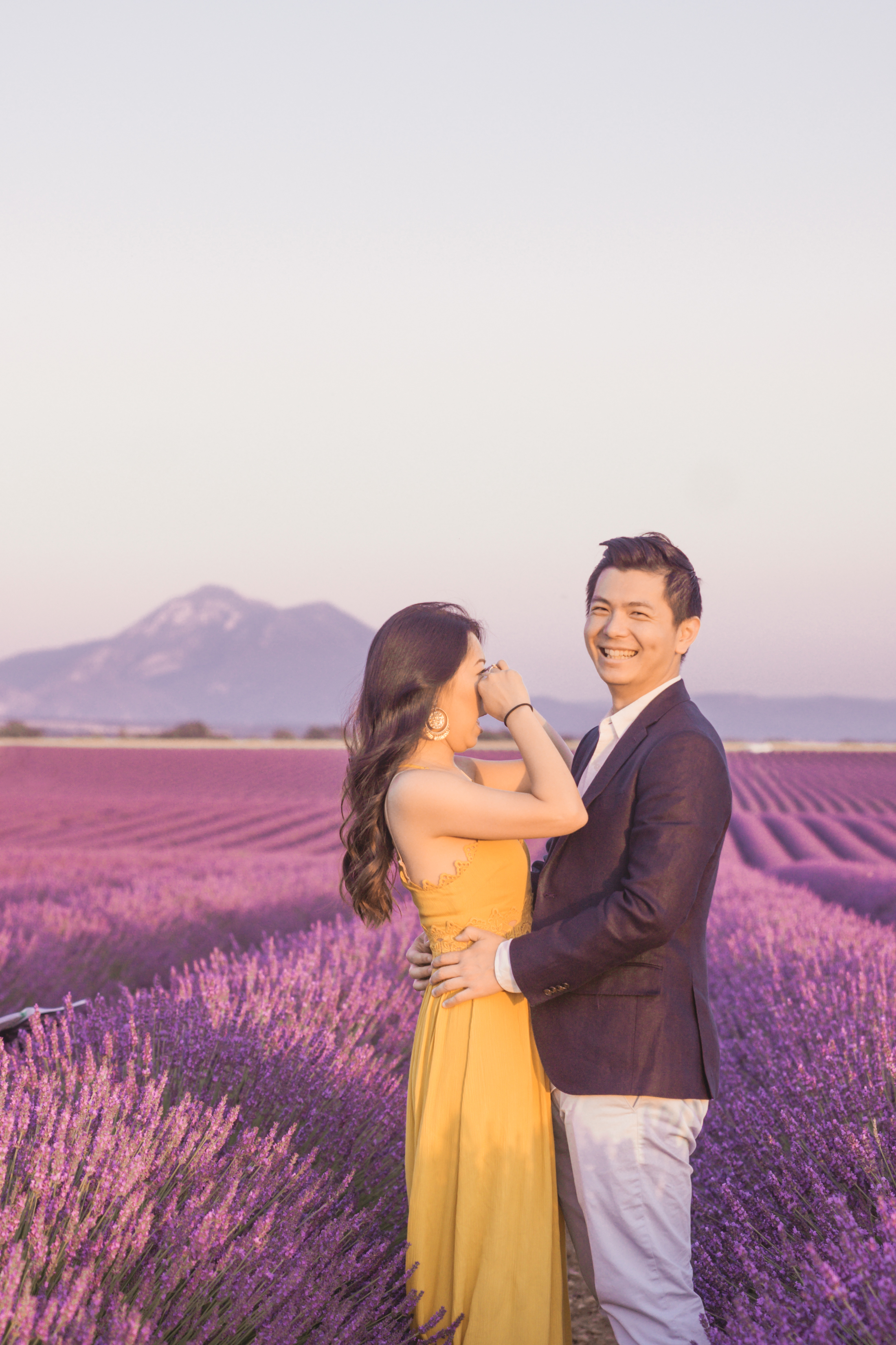 When the day of the ‘photo shoot’ arrived, Flytographer Andrea, Samuel and his unsuspecting girlfriend met up as planned and they started taking pictures as they made their way towards the lavender. Not far away, among the rows of breathtaking lavender, Flytographer Cyril, was there waiting with the string quartet. As they got closer to the string quartet, Andrea suggested that they get their picture taken with the musicians. So as she snaps away, they all of a sudden begin to play the couple’s favourite song and next thing you know, Samuel was down on one knee. Her answer? She said yes of course!