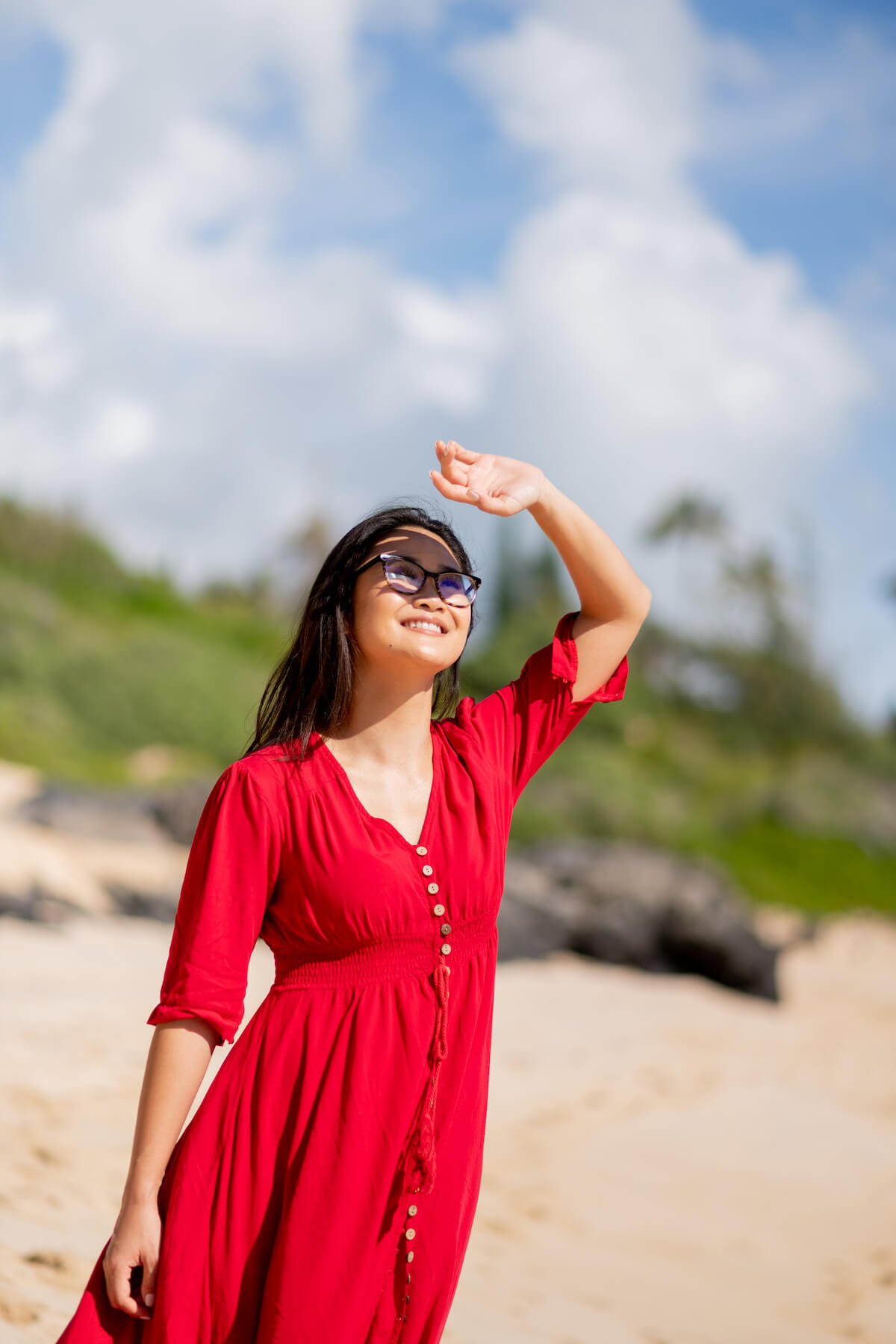 The photo above was taken when the sun was high in the sky, which created harsh lighting conditions. When the subject raised her hand to block the sun, a stark shadow appeared.