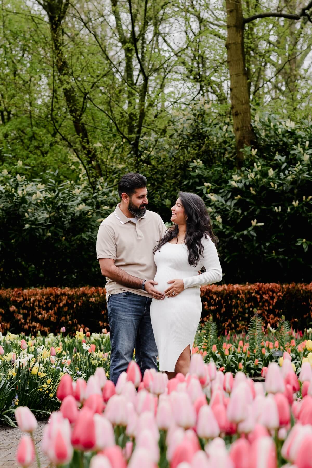 Photo: Joanna in Amsterdam for Flytographer. Urvisha and partner capture memories in Amsterdam with a babymoon photoshoot at the Keukenhof Gardens.