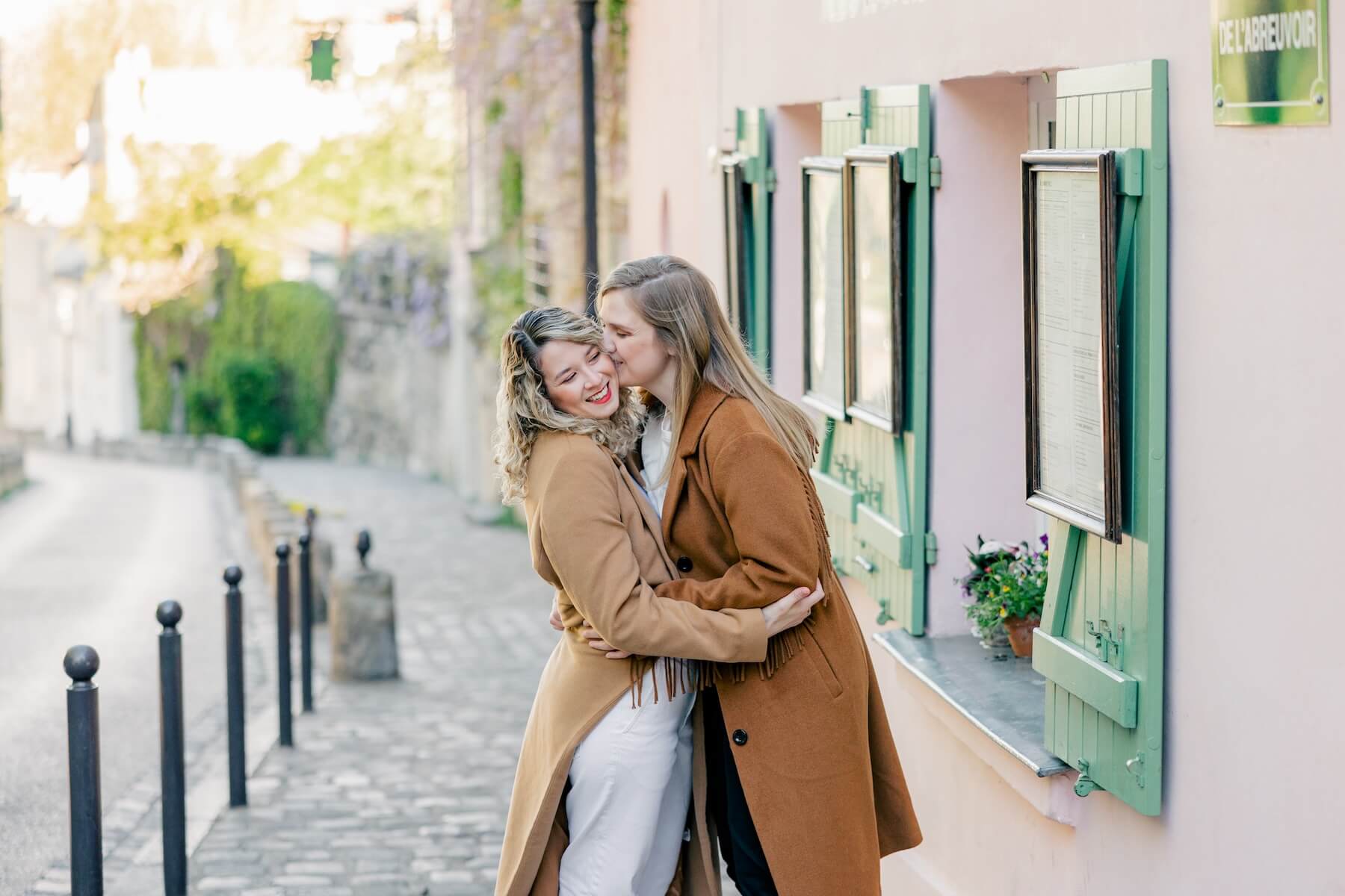 There are so many fun couple’s photoshoot ideas! The world is your stage: you can dance like no one’s watching, hold hands, or strike a coordinated pose. You can also just relax and think of the shoot as an excuse to cozy up with your soulmate. 👩❤️💋👩
