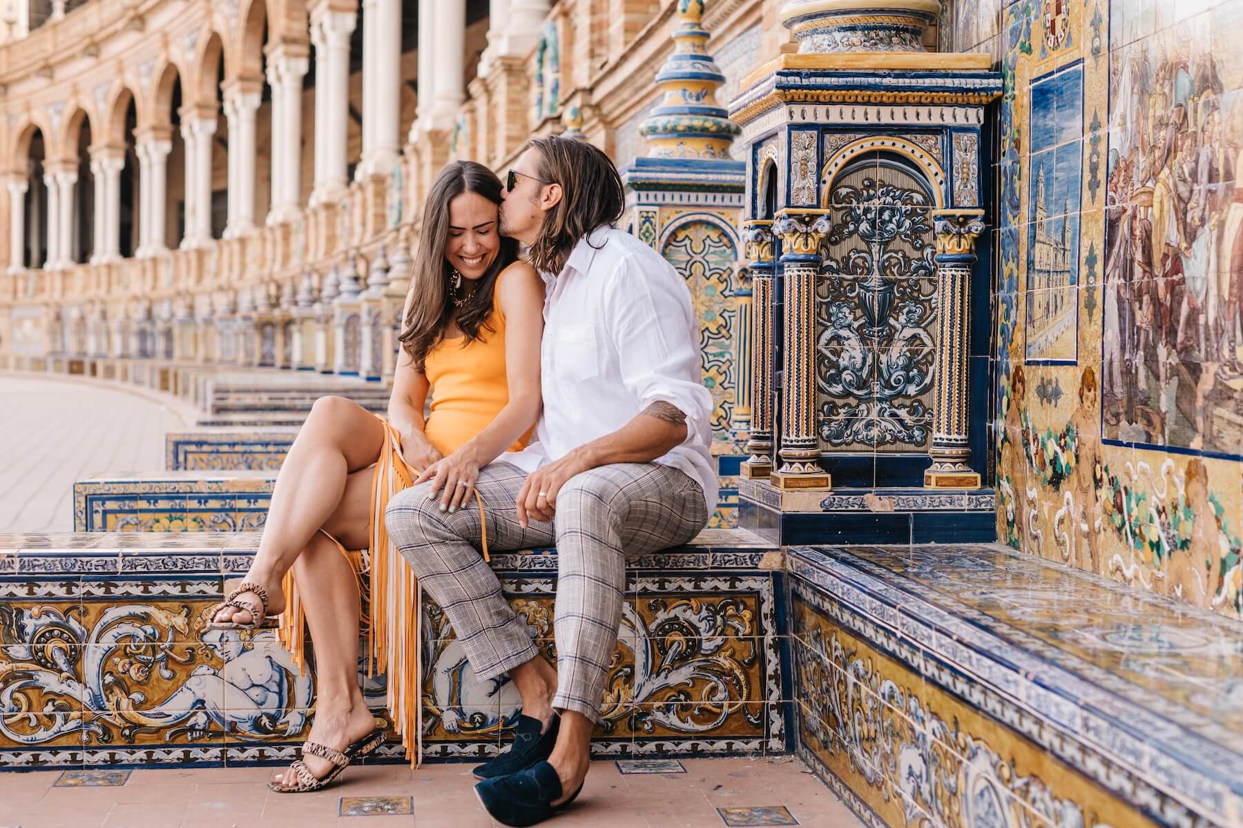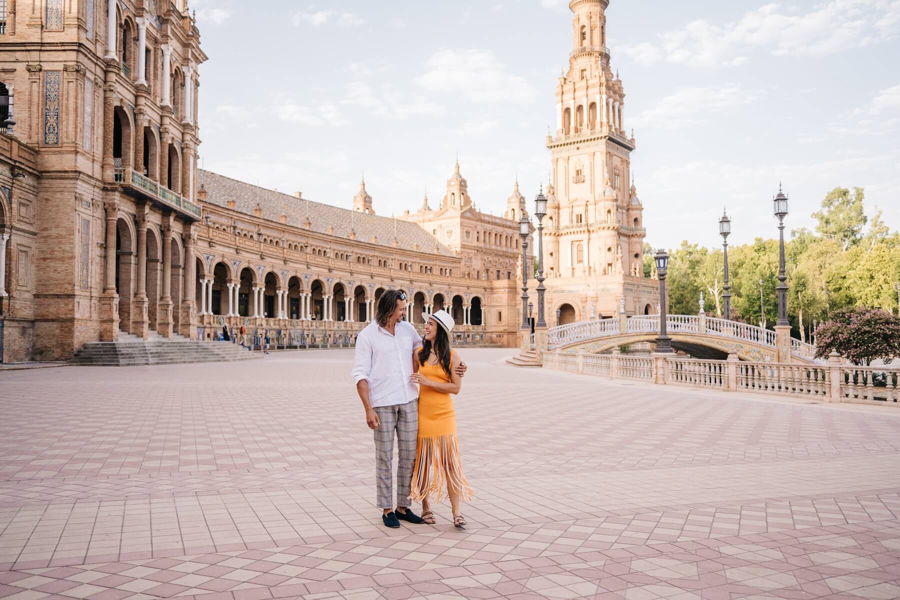Photo: Gabriel in Seville for Flytographer. Leslie and partner capture memories in Seville with a couples photoshoot at Plaza de España.