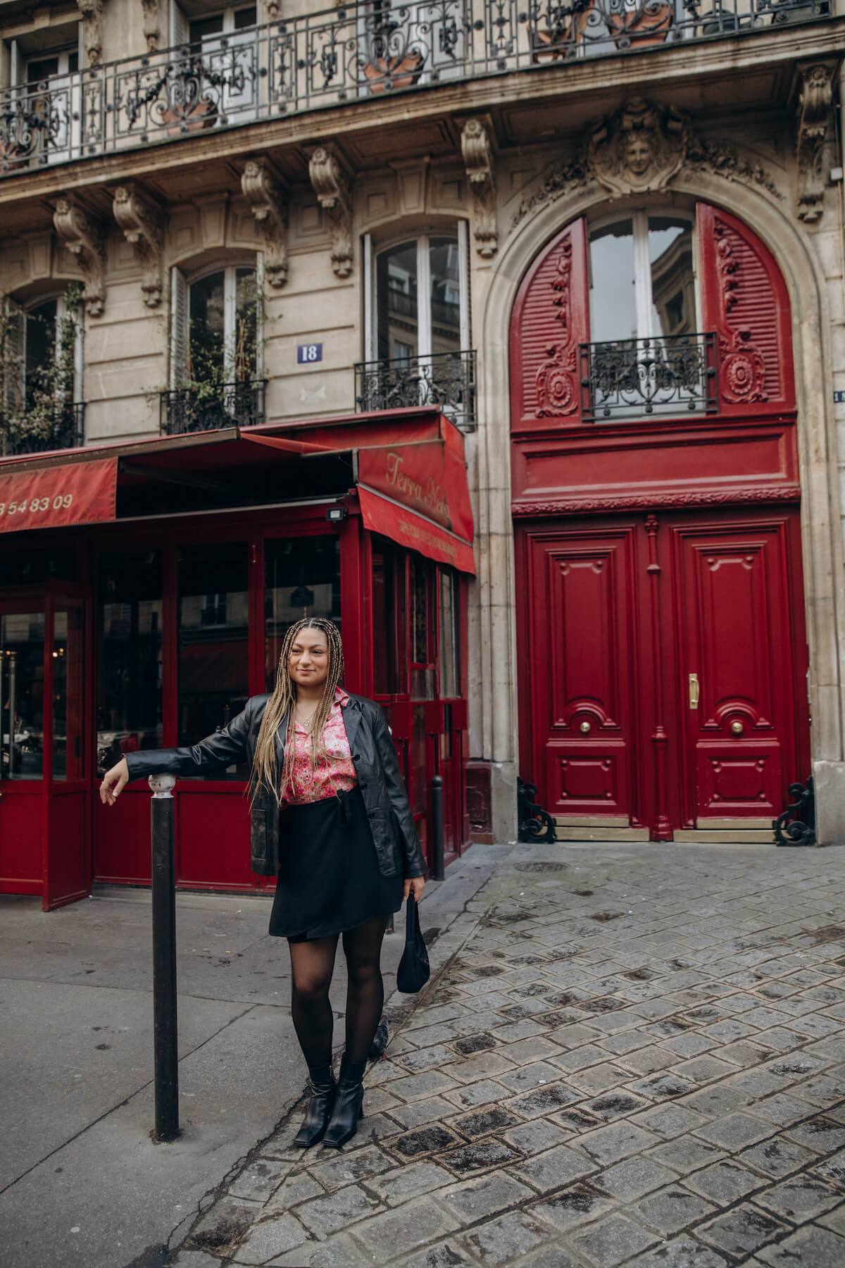 Start at Gabriel’s restaurant, aka Terra Nera in real life, to capture its typically Parisian red facade. Quintessentially Parisian, tables line the sidewalk outside the bistro, and the cobblestone streets and typical Parisian architecture create a scene straight out of Emily in Paris. 😍