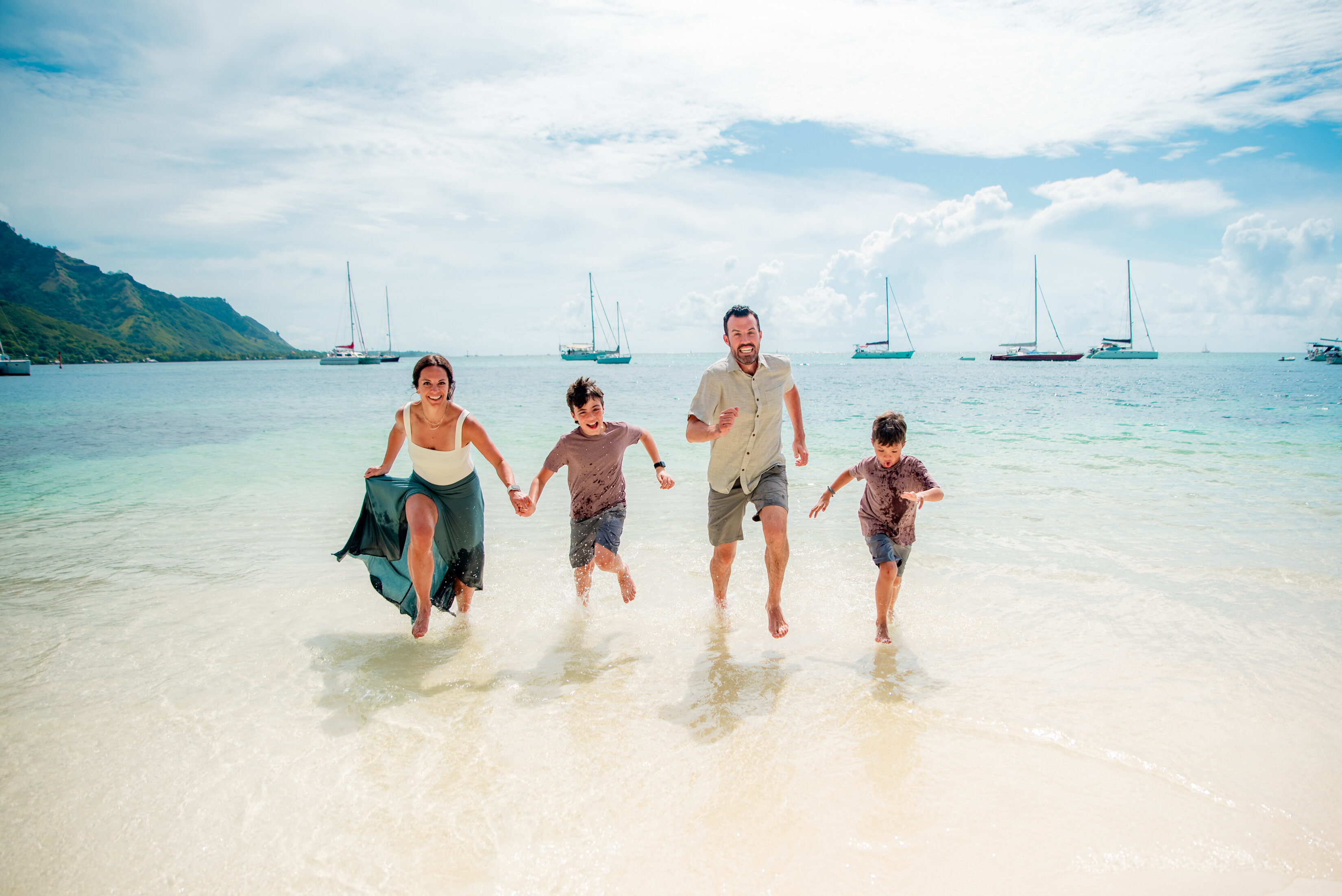 Photo: Steve in Moorea for Flytographer. Morgan and family are playing in the water of French Polynesia on a family photoshoot.