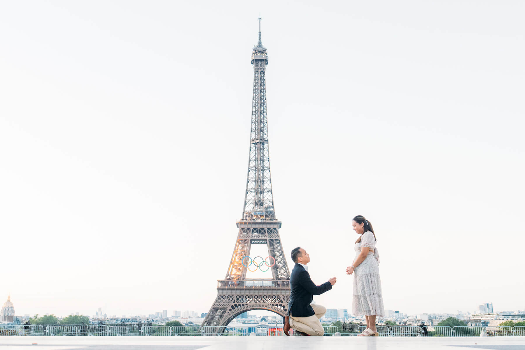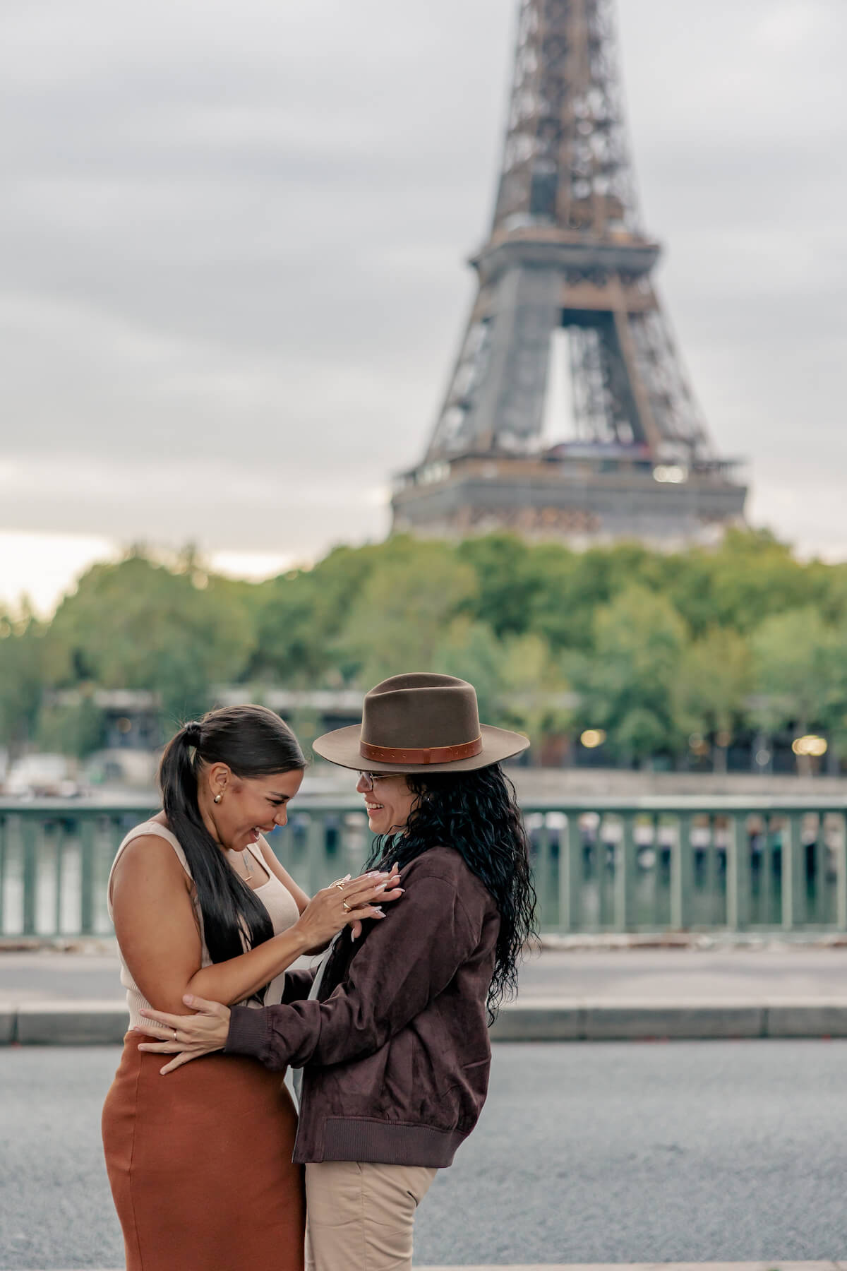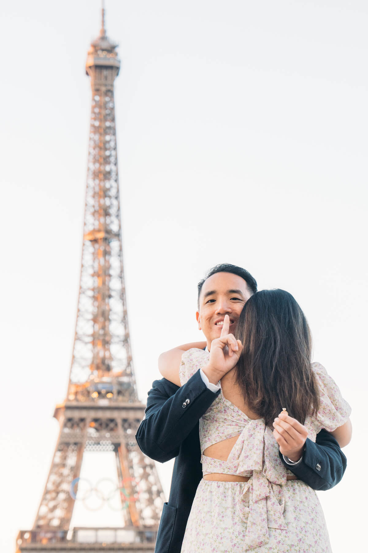 Photo: Rachael in Paris for Flytographer. Stephanie and partner celebrate a proposal in Paris with a proposal photoshoot at Bir Hakeim Bridge & the Eiffel Tower.