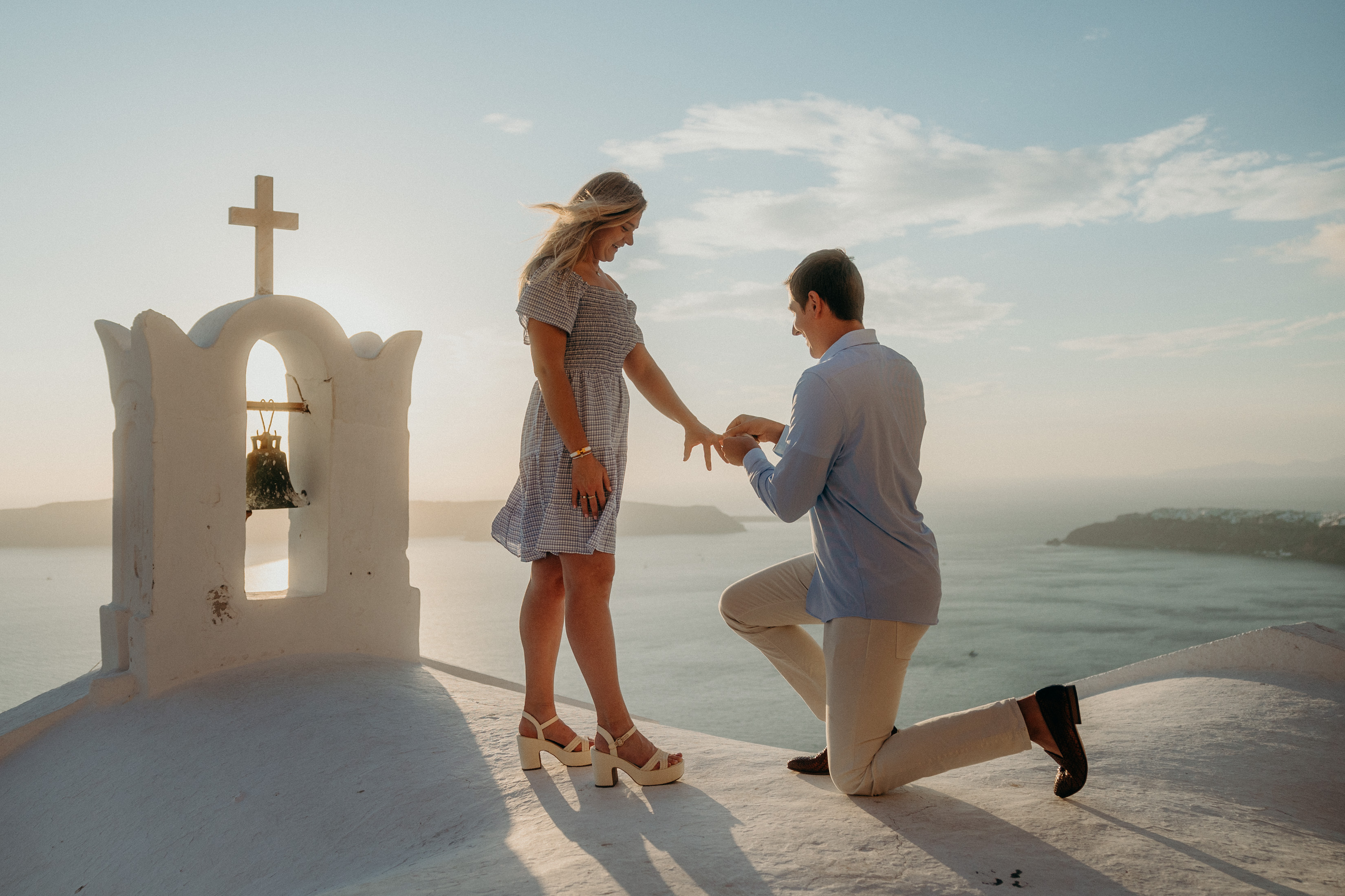 Photo: Spyros in Santorini for Flytographer Dominik and partner get engaged during golden hour in Imerovigli Village.