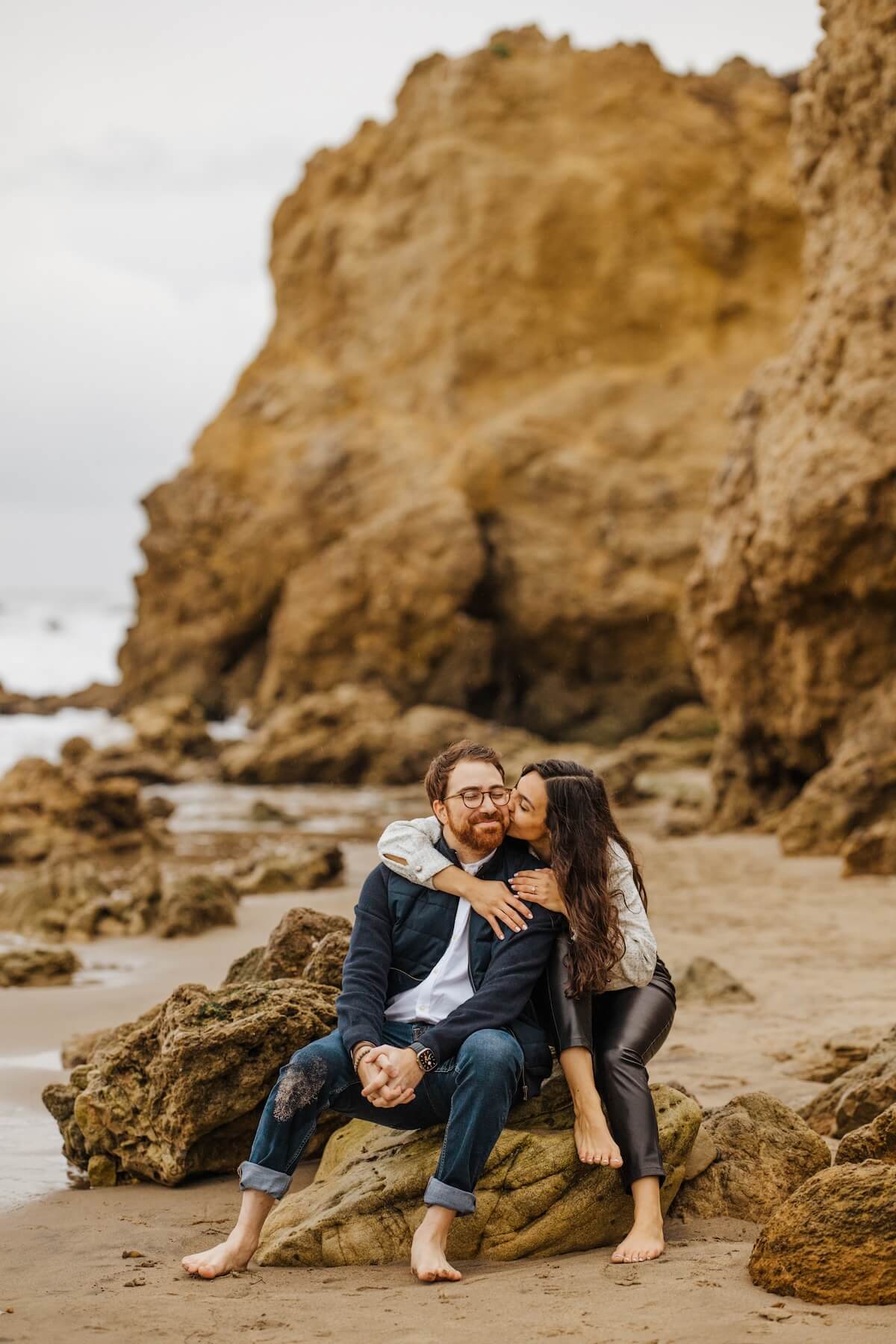Whether it’s overlooking the Los Angeles skyline, nestled amidst lush greenery, or perched on a sandy beach watching the sunset, sitting poses provide an intimate and serene backdrop for your engagement photos. Relax and embrace each other to enhance the romantic ambience.🏝️