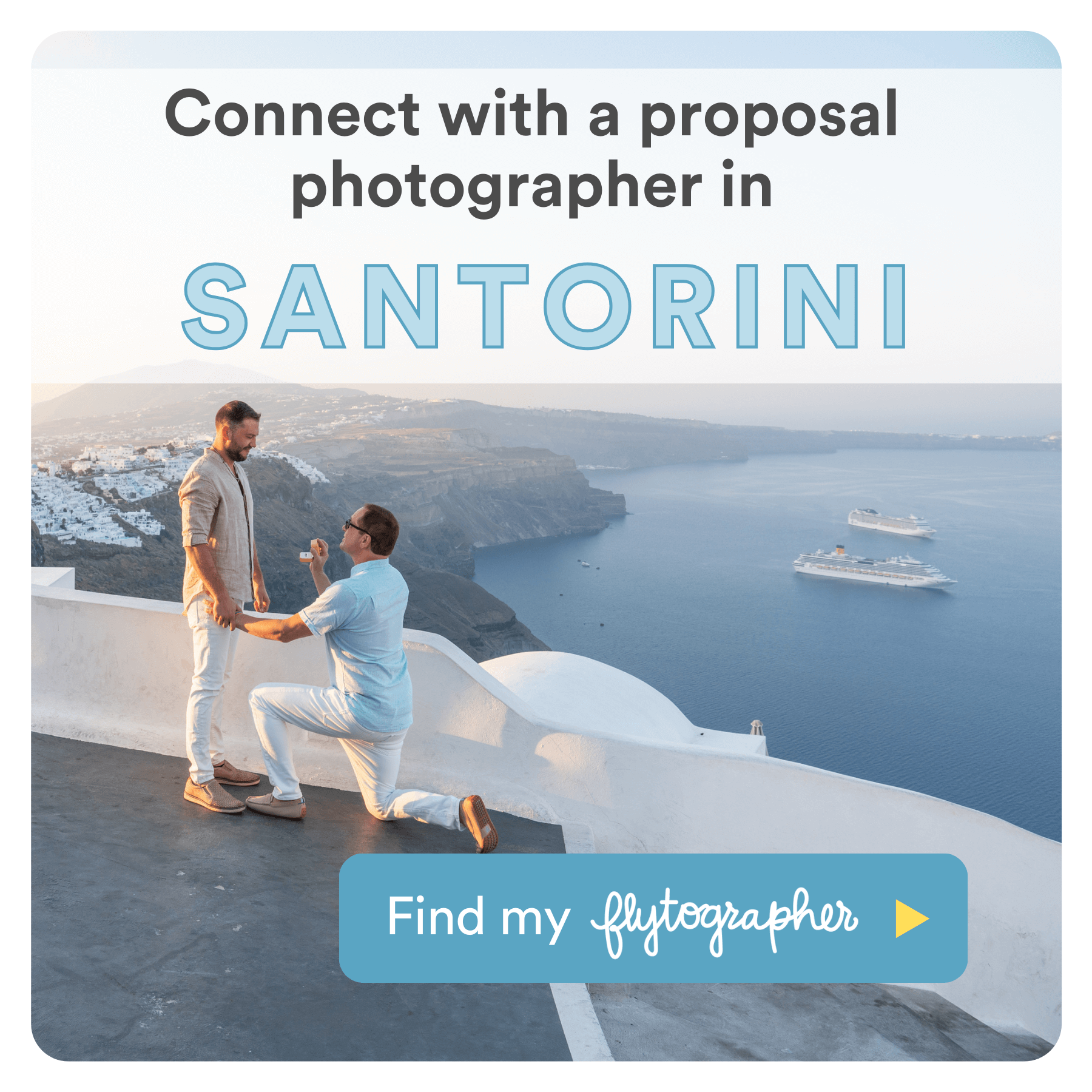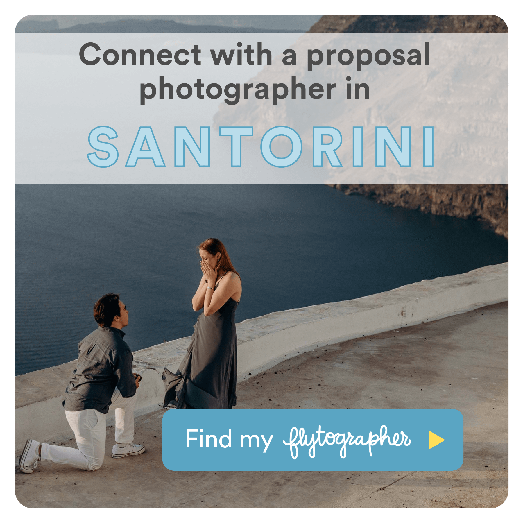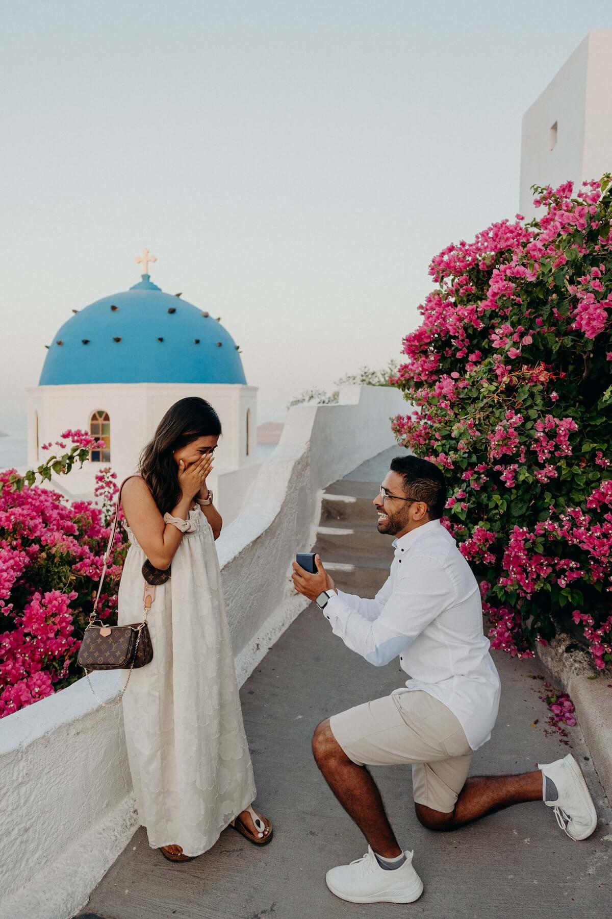 - Choosing your Santorini proposal photographer: You can’t put a price on peace of mind. Flytographer pairs you with professional proposal photographers from all over the world.