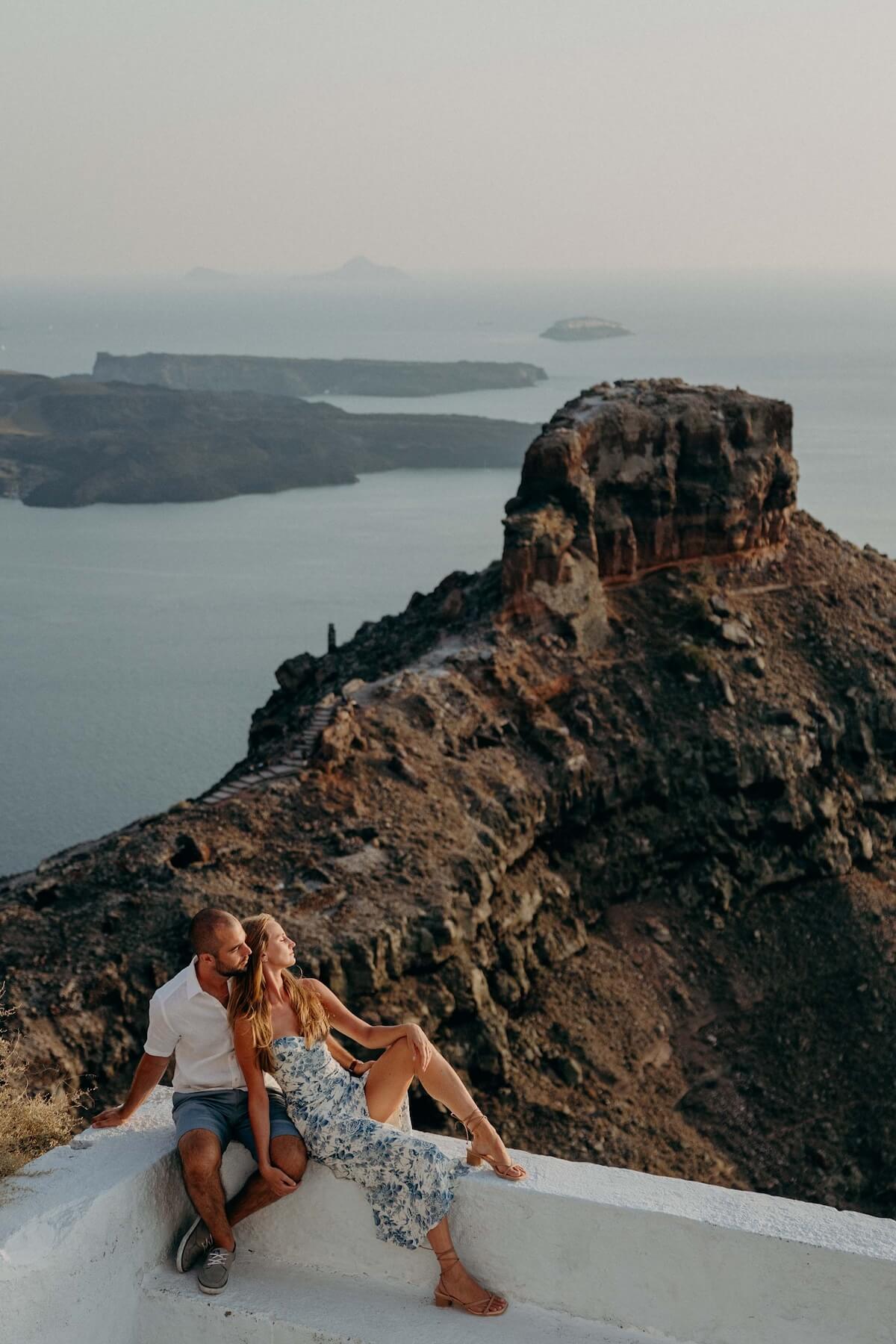 - Seated lean-and-look. Whether it’s admiring the picturesque views of the cliffs rising out of the Aegean Sea, the iconic, blue-domed church in Oia, or gazing at another perfect golden sunset, seated poses give you tranquil and intimate engagement photos. Plus, they let you relax and allow for opportunities to include a number of different angles—more than typical standing poses. Wrap your arms around each other, relax, and truly take in the beauty of this superb Greek Island. Let your Santorini proposal photographer do the rest!