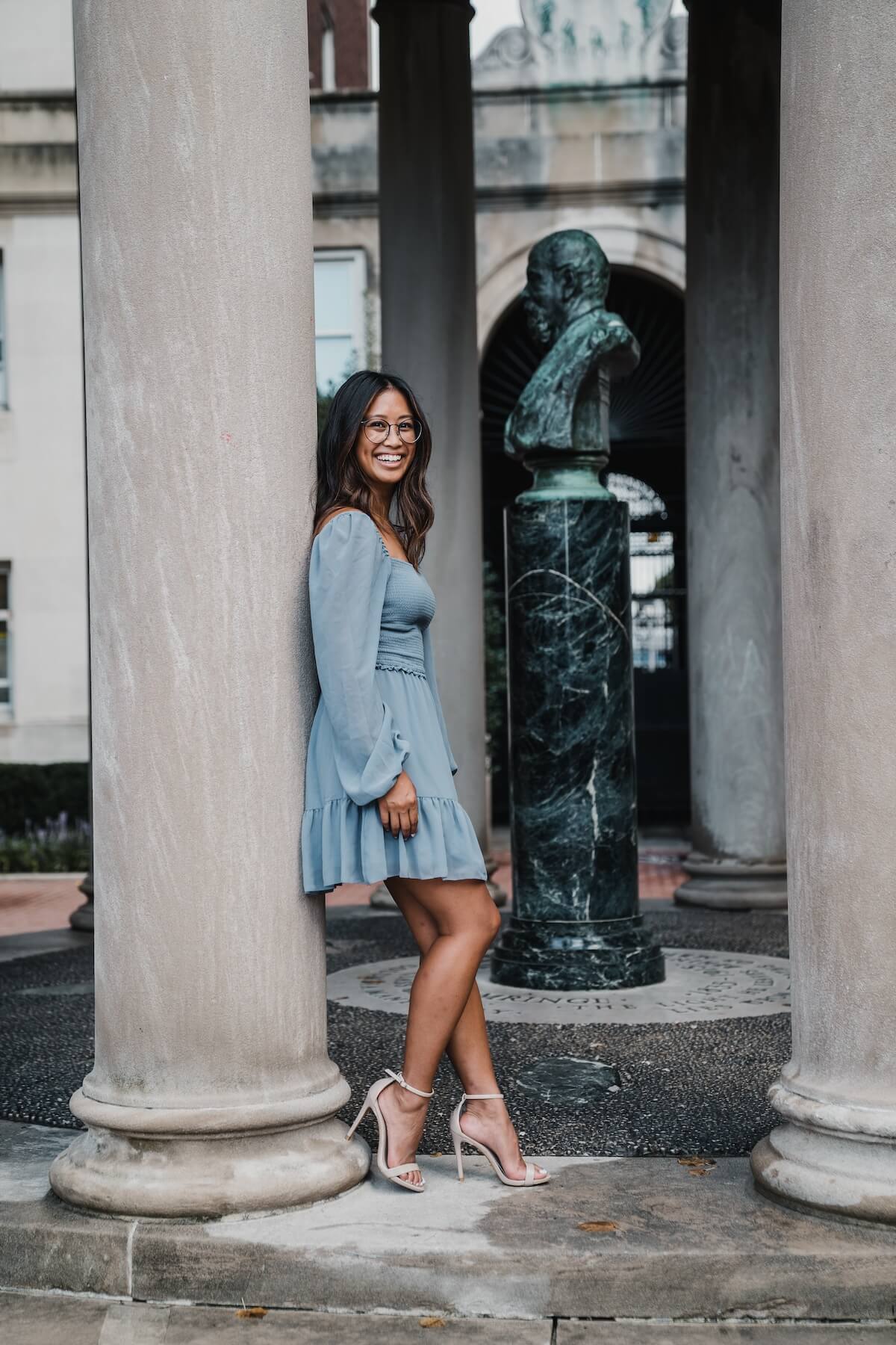 Your body can also give away how confident you are. As you step into a new life, this is a time for confidence. This is key for how to take good graduation photos! Gazing at the camera with an expansive pose, such as standing tall with an open chest and hands on your hips, is a great way to build connection and show aptitude in your pics. But don’t overdo it; you don’t want to come across as an intimidating person. Throw in a light smile, and your grad photos are good to go.