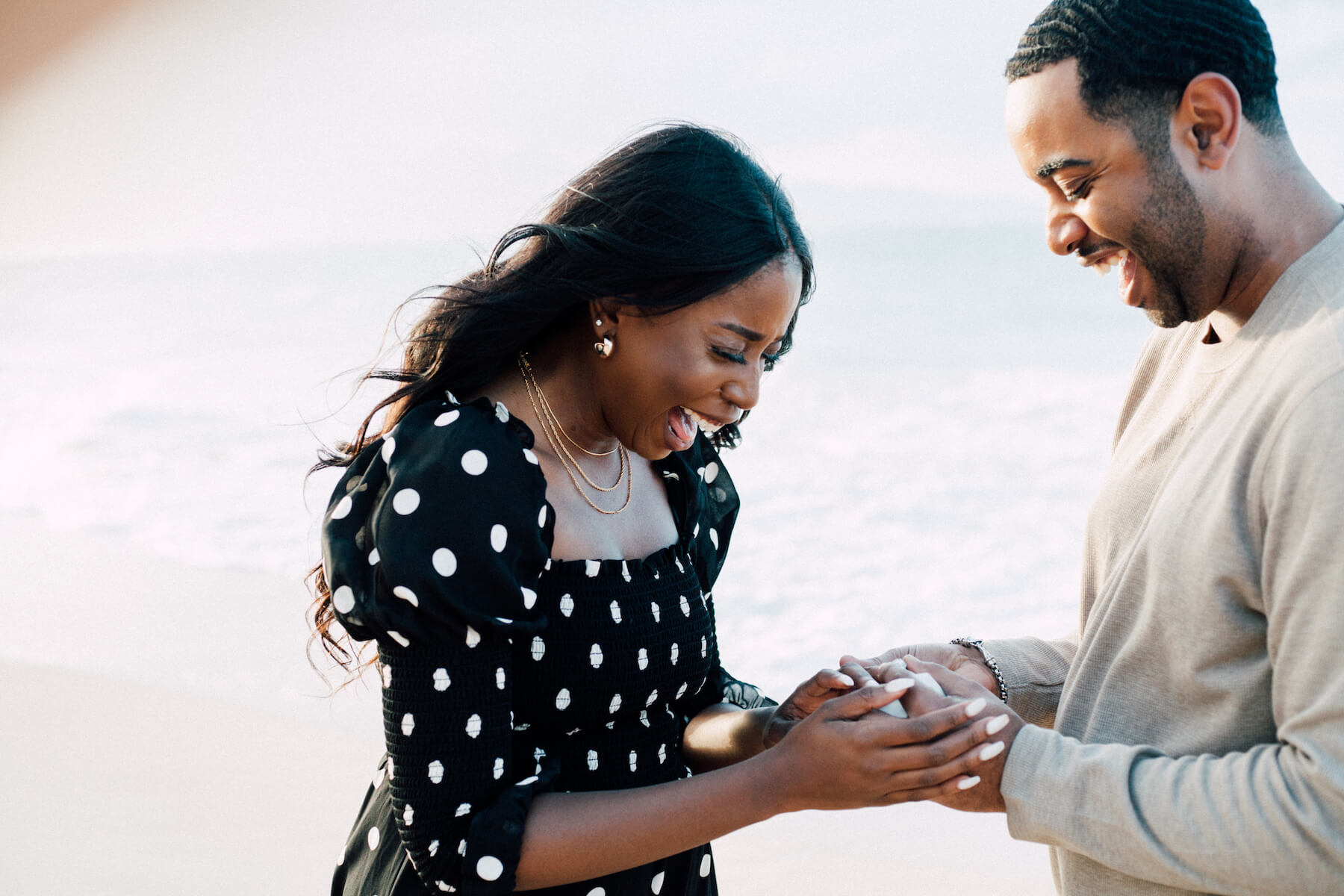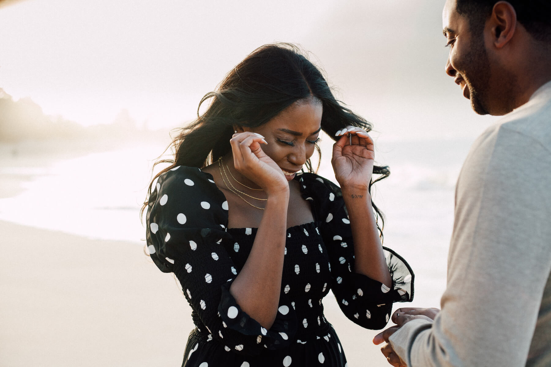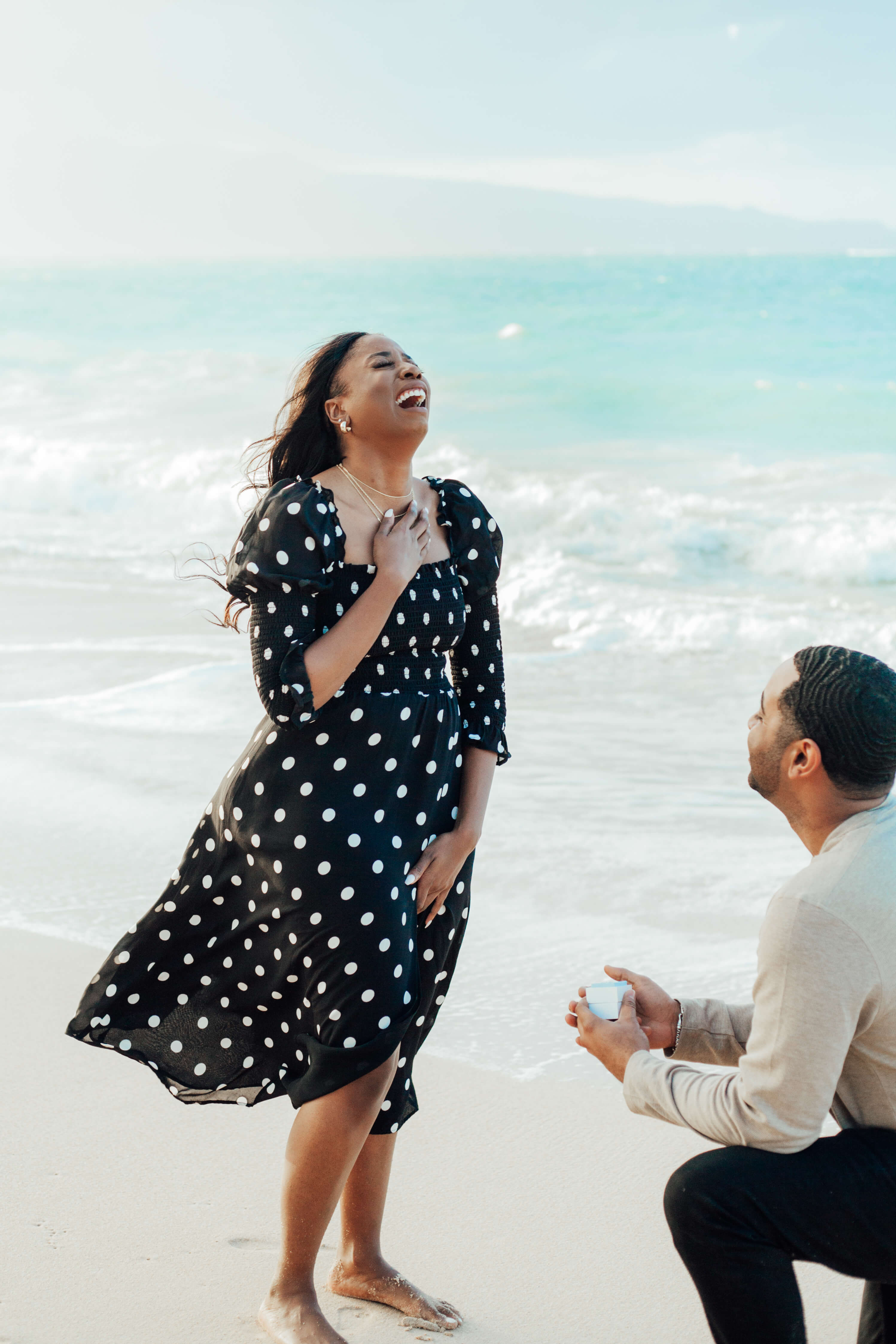 PROPOSAL MOMENT: “During the initial photo shoot, I had the ring box in my back pocket and had to manage to keep my body facing forward so that my curious fiancée wouldn’t start asking questions. I can remember a few instances when I had to grab her hand so that she wouldn’t graze the ring box just below my lower back. Once we had taken a few shots by the lifeguard stand and on the edge of the beach, Rojeena signalled to me that the lighting was perfect. As the waves receded back into the ocean, I grabbed my fiancée’s hand and told her, ‘You already know what this is.’ Immediately, she was overwhelmed with emotion. I told her how much she had already impacted my life and how much I was looking forward to advancing our relationship for years to come. Our relationship started more than 3,000 miles apart, and now just over two years later, we are officially engaged and finally in the same time zone to start our next chapter.”