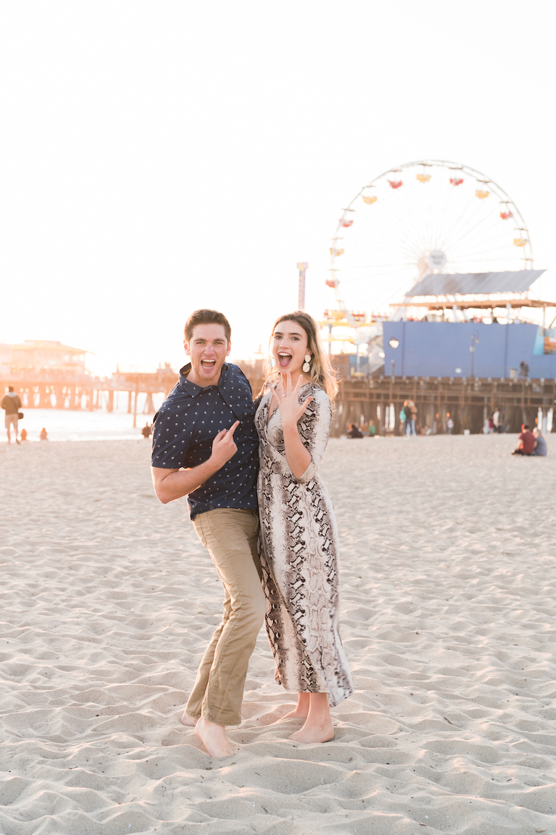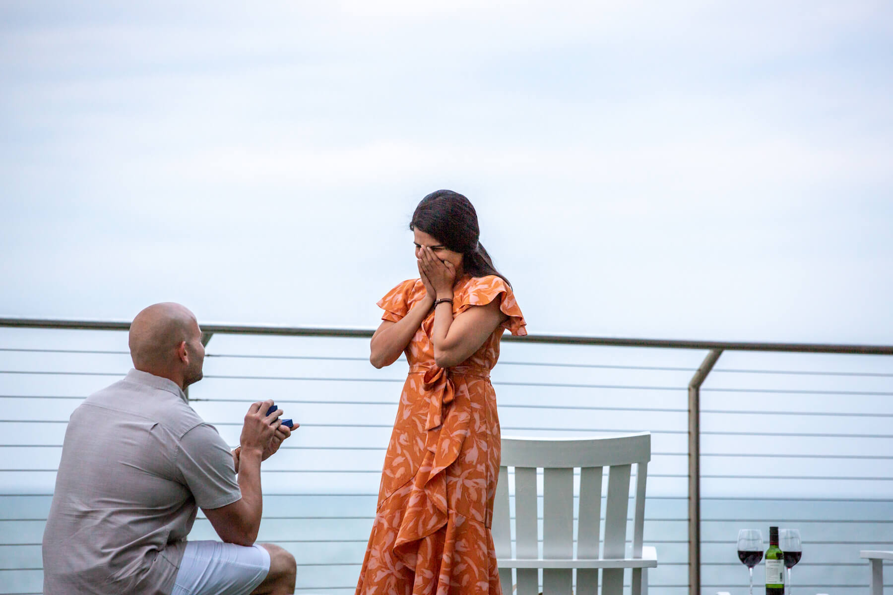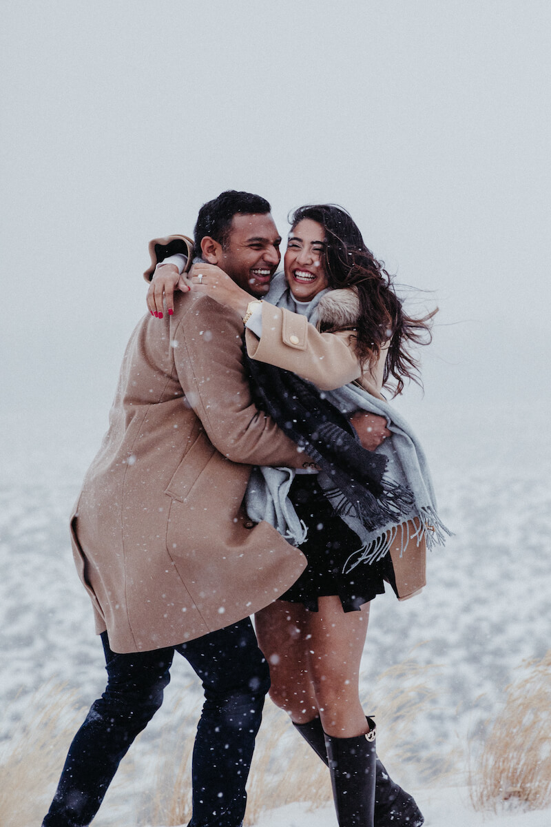 “So what was most important was the date 02/02/2020. Anju is fond of numbers, especially unique dates. It really mattered to me that I proposed to her on that date. At the time I was set to move back to India for good and I wanted to make sure we were engaged. I told her since I couldn’t get her married on that day I would do something special like a date for her. She’s always been the planner in our relationship but I told her I’d like to take charge. I told her I would take her to this fancy restaurant, but instead, I took her to the beach, pretending that this place I wanted to take her was shut and it’ll open in some time, so let’s walk to the end of the walkway. I told her the view was excellent and it truly was something we’ve never seen. Once [Flytographer] Michael was there to signal the keyword that the lighting was perfect, I got down on one knee; she knew exactly what this was and I looked at her knowing this was exactly the moment she has been waiting for her entire life.