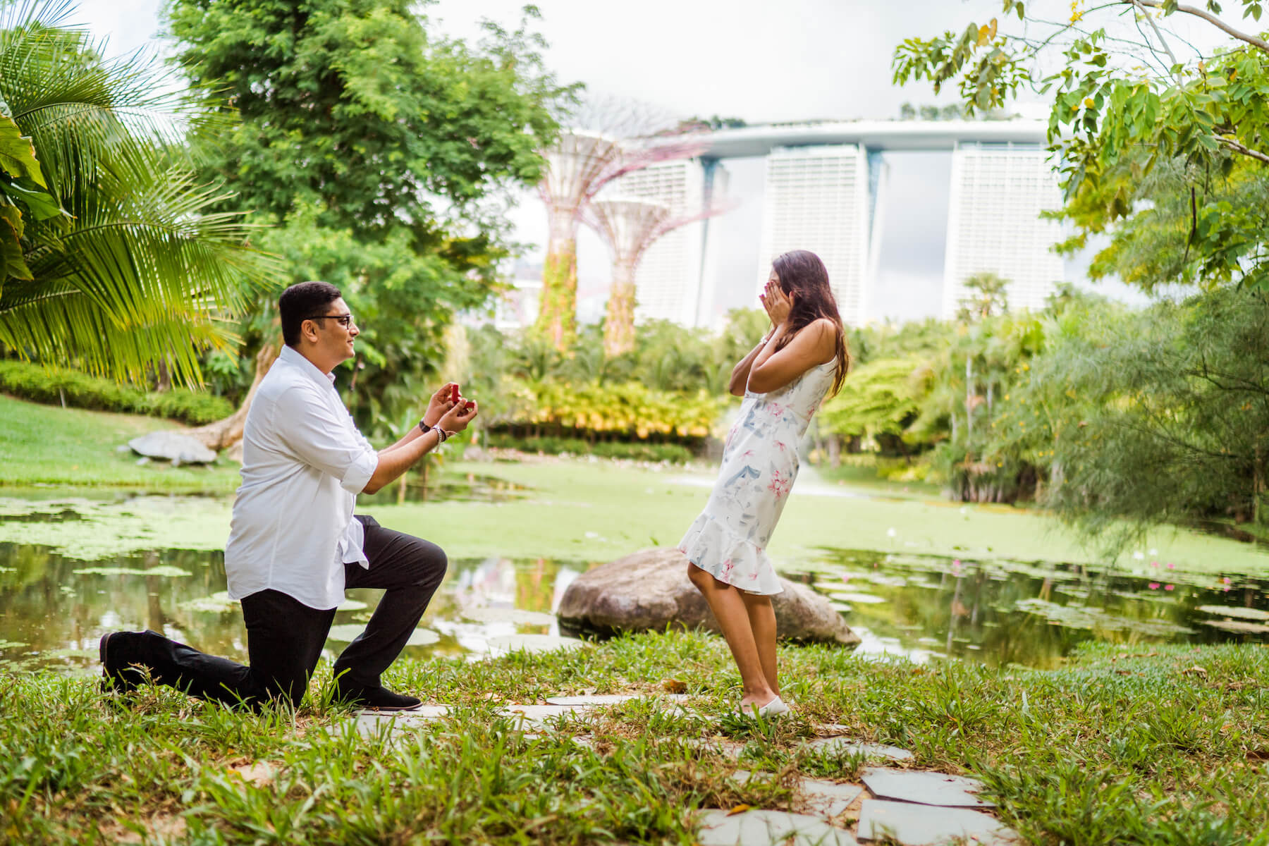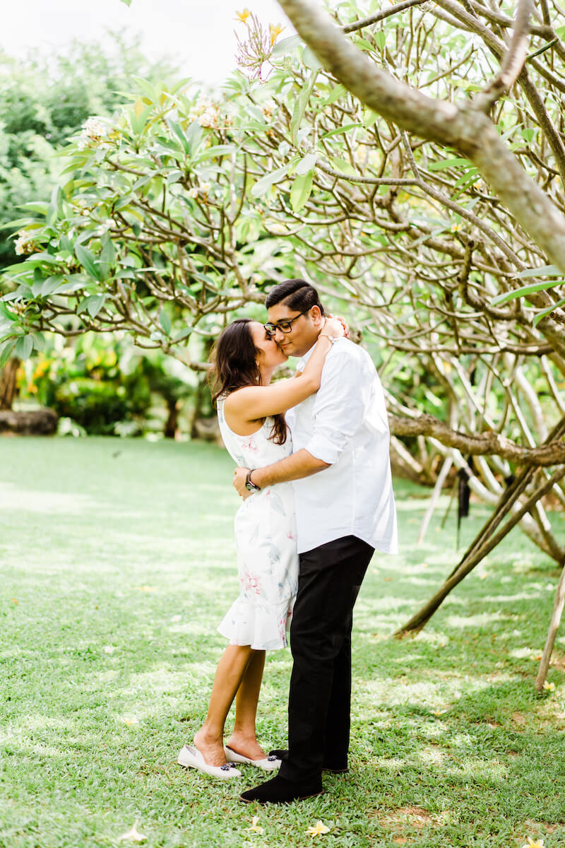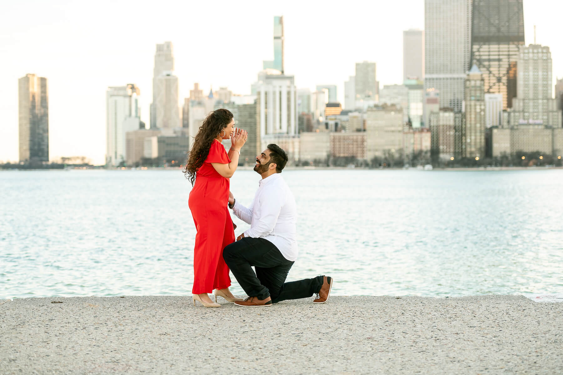 “So what was most important was the date 02/02/2020. Anju is fond of numbers, especially unique dates. It really mattered to me that I proposed to her on that date. At the time I was set to move back to India for good and I wanted to make sure we were engaged. I told her since I couldn’t get her married on that day I would do something special like a date for her. She’s always been the planner in our relationship but I told her I’d like to take charge. I told her I would take her to this fancy restaurant, but instead, I took her to the beach, pretending that this place I wanted to take her was shut and it’ll open in some time, so let’s walk to the end of the walkway. I told her the view was excellent and it truly was something we’ve never seen. Once [Flytographer] Michael was there to signal the keyword that the lighting was perfect, I got down on one knee; she knew exactly what this was and I looked at her knowing this was exactly the moment she has been waiting for her entire life.