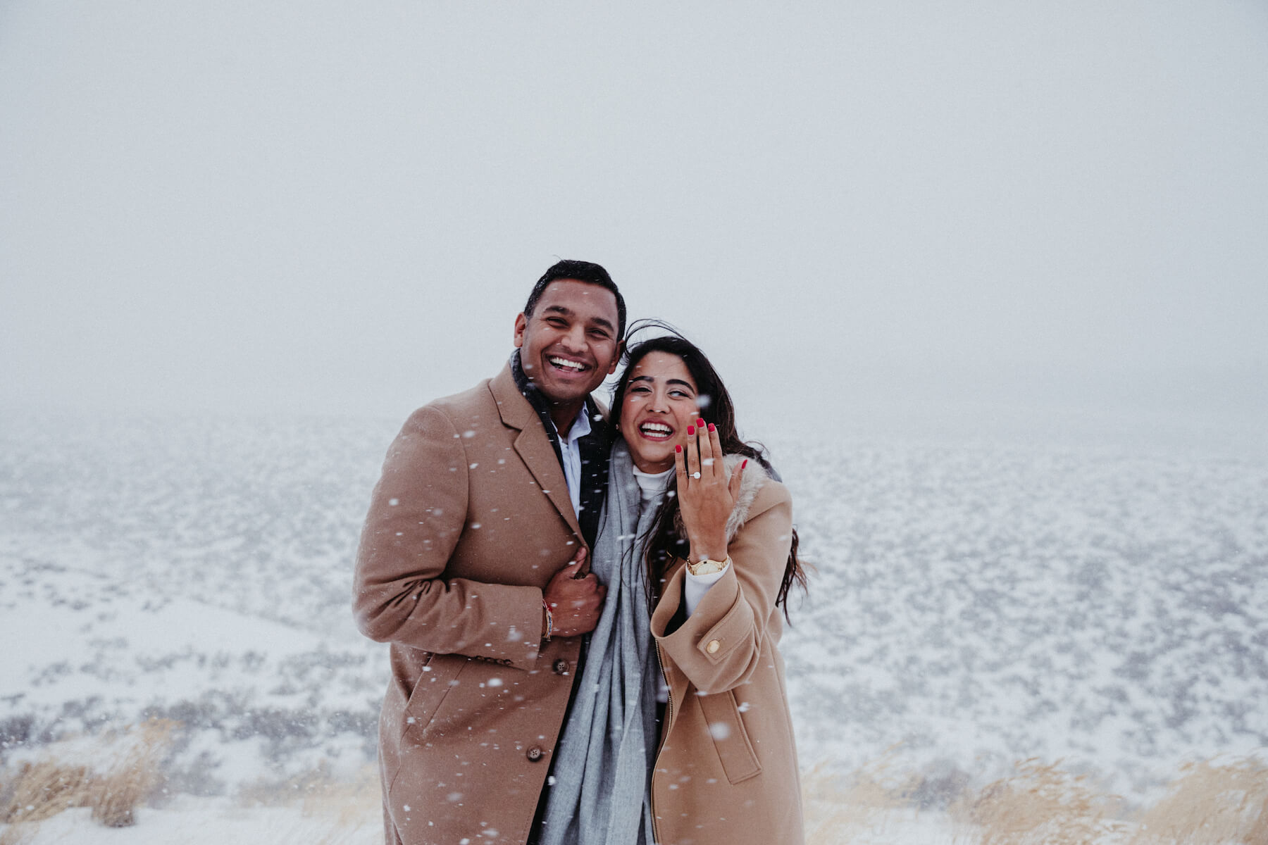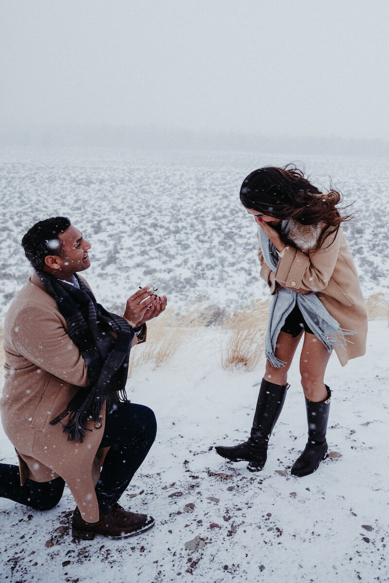 PROPOSAL MOMENT: “Bianca is a winter girl through and through. She loves the cold, winter snow and scenery, and adventure. Proposing in Jackson Hole allowed me to encompass all those things. I had initially planned to propose in front of the Teton Mountains, but the weather had other plans that day. As I got down on one knee, we were instantly hit with a blizzard and the Tetons were no longer visible. The snow came down so hard that neither of us remembers what I said, but we do remember how much we were laughing and crying out of pure joy. Bianca of course said YES and the rest is history. I’ll say, initially I was bummed about the blizzard ruining our proposal backdrop, but the pictures turned out absolutely stunning and captured exactly what I would’ve wanted — our genuine love for each other. While every picture has hair flying in the wind and snow all over us, I loved that our excitement and happiness showed through every picture. I could not have asked for a more beautiful, unpredictable proposal!”