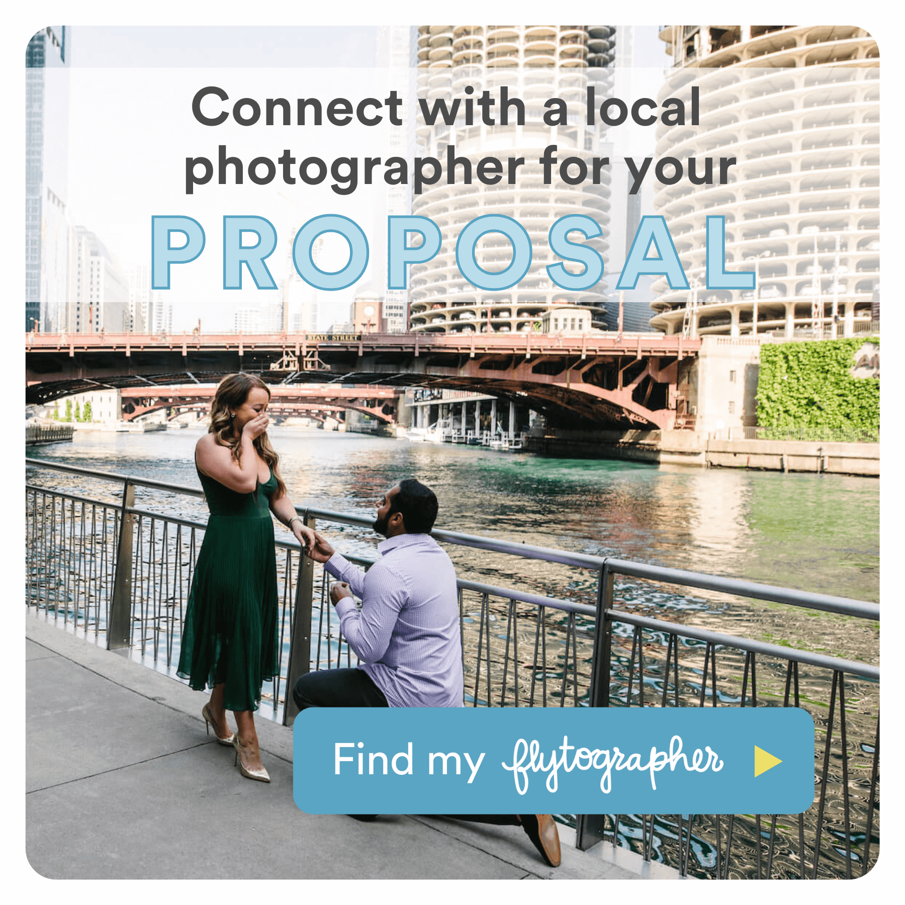 Connect with a local Chicago Flytographer to help plan and capture this special moment forever. Chicago proposal photographers know all the best spots and how to handle the city’s changeable climate, so you can focus on popping the question. Bonus: you won’t have to rely on a passerby to take your first picture as an engaged couple! Here’s to happily ever after. Cheers!
