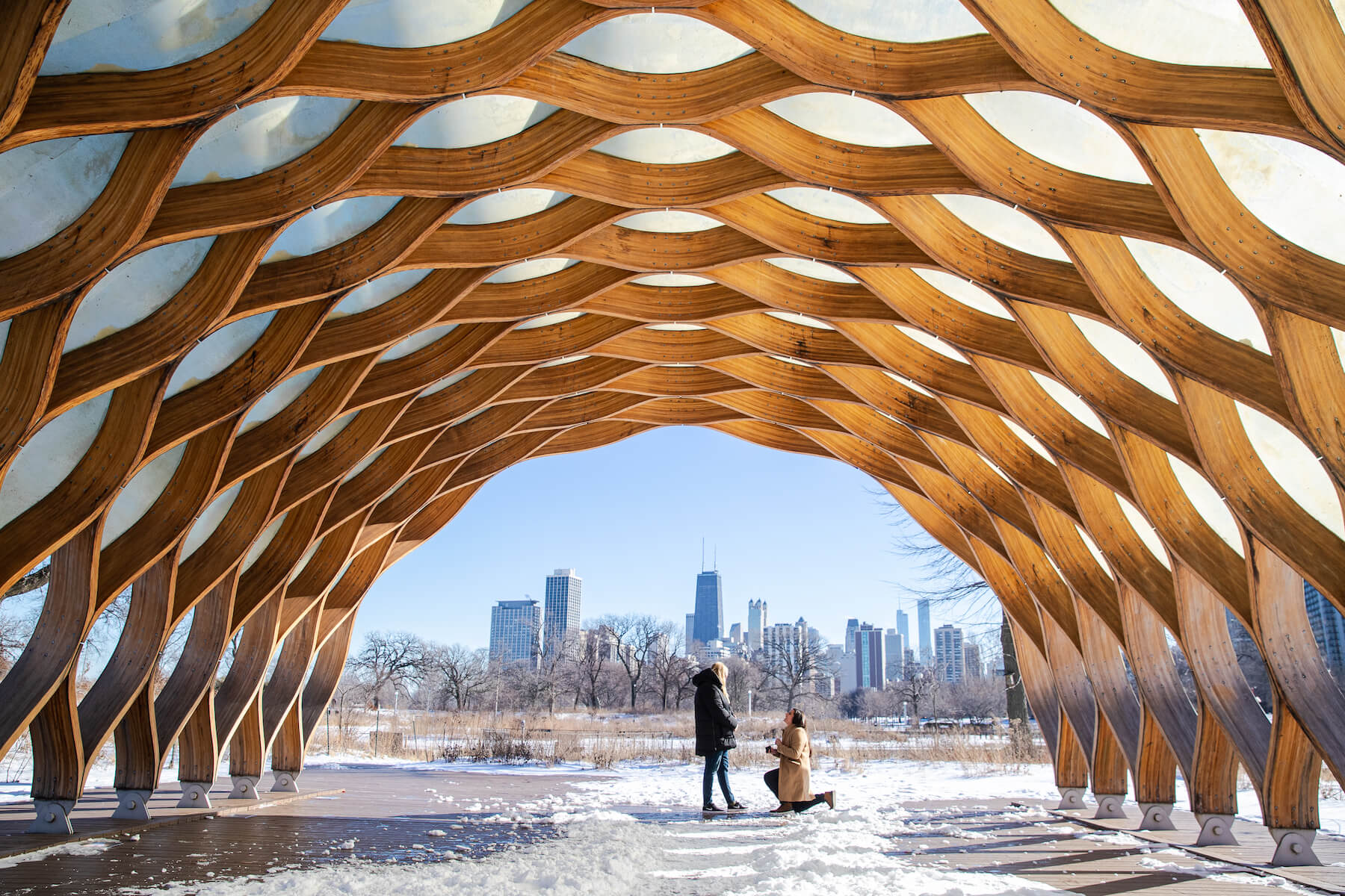 Although sunrise and sunset are beautiful times to propose during the summer, mid-afternoon is better during the cold Chicago winter. Overcast skies will diffuse the bright sunshine, creating a beautiful soft light for romantic photographs. This is the perfect opportunity to bundle up and head out to downtown Chicago’s famous public parks, where romantic fountains and stunning sculptures add drama to the setting.