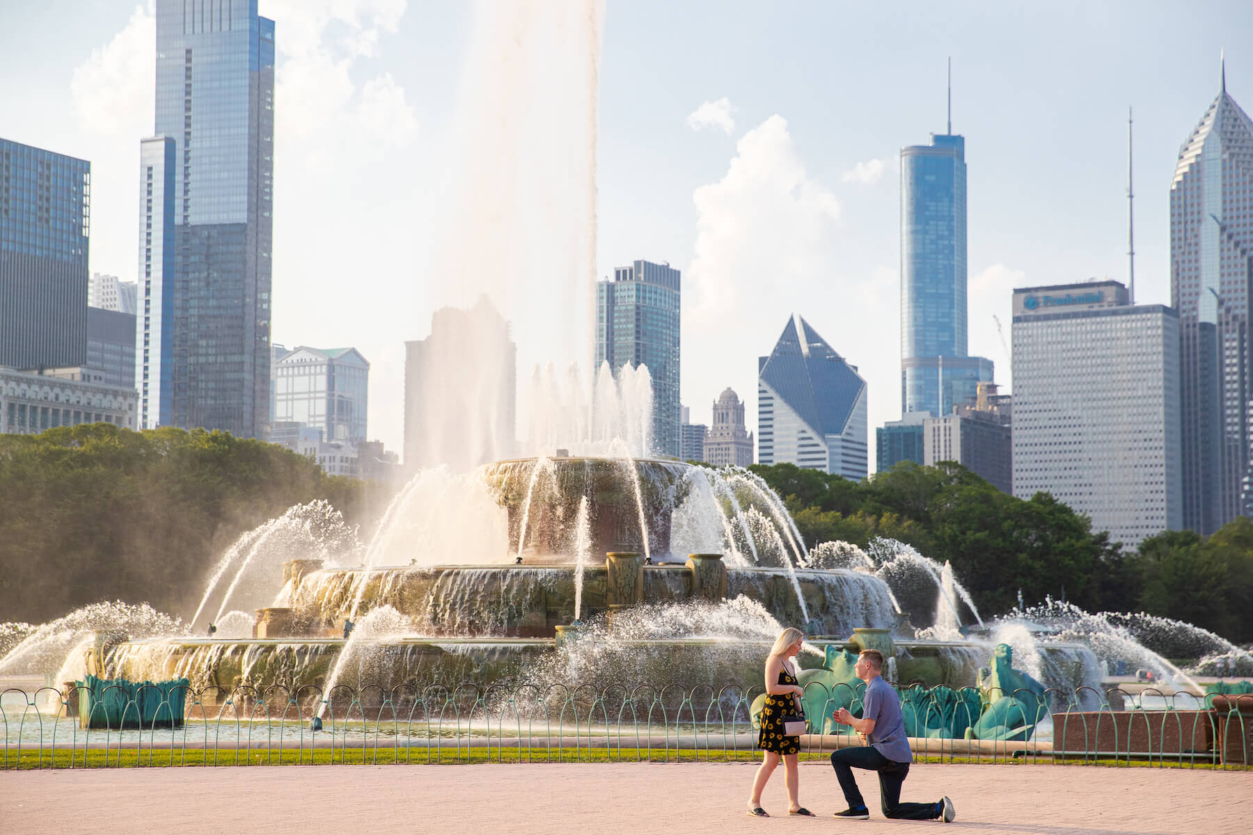 Photo: Lukas in Chicago for Flytographer. Aaron and partner celebrate a proposal in Chicago with a proposal photoshoot at the Buckingham Fountain.