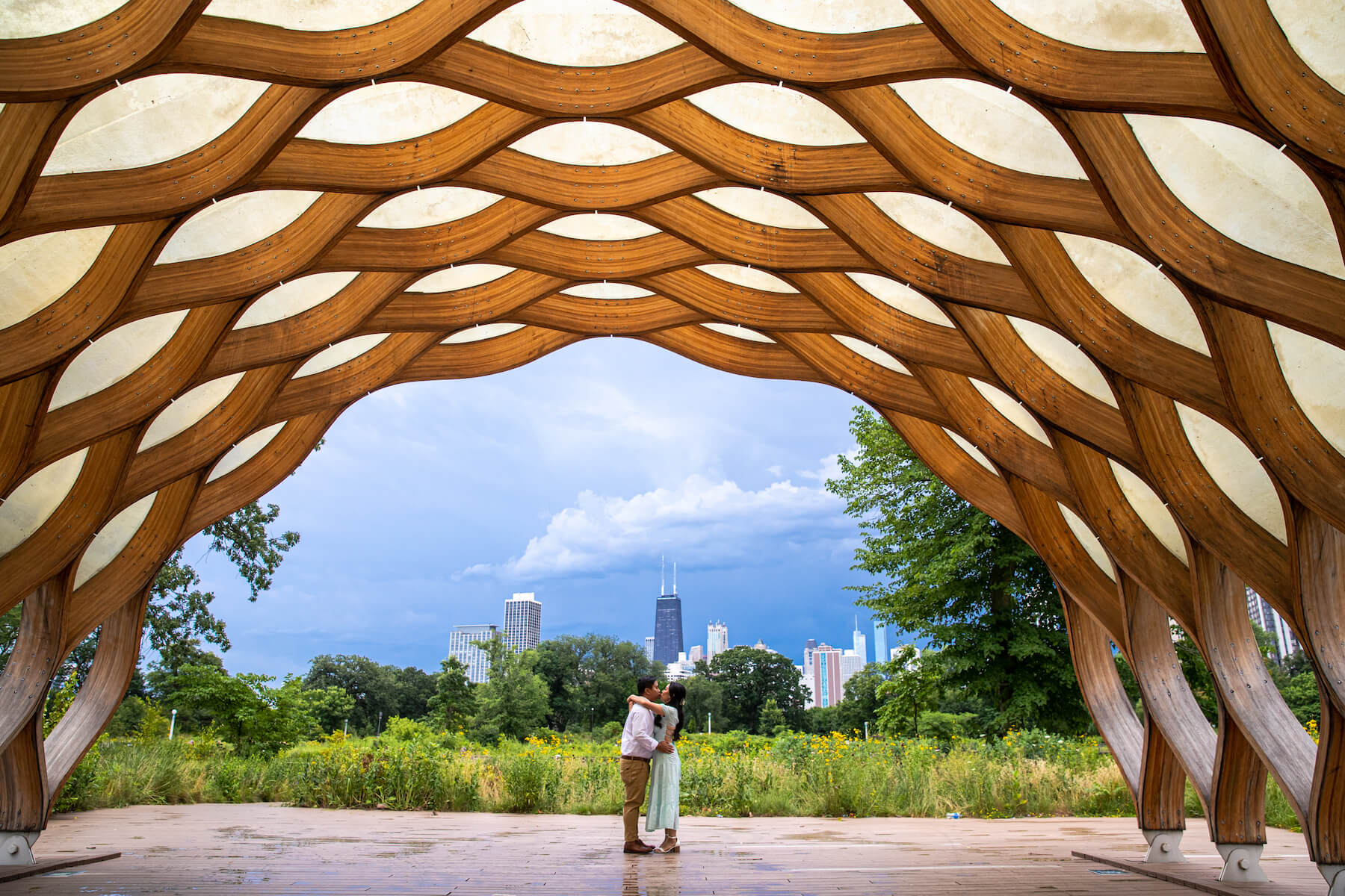 The Honeycomb, as it is affectionately known locally, is a walk-through art installation located in Lincoln Park Zoo. Inspired by a tortoiseshell, the graceful arch frames the city skyline beautifully.