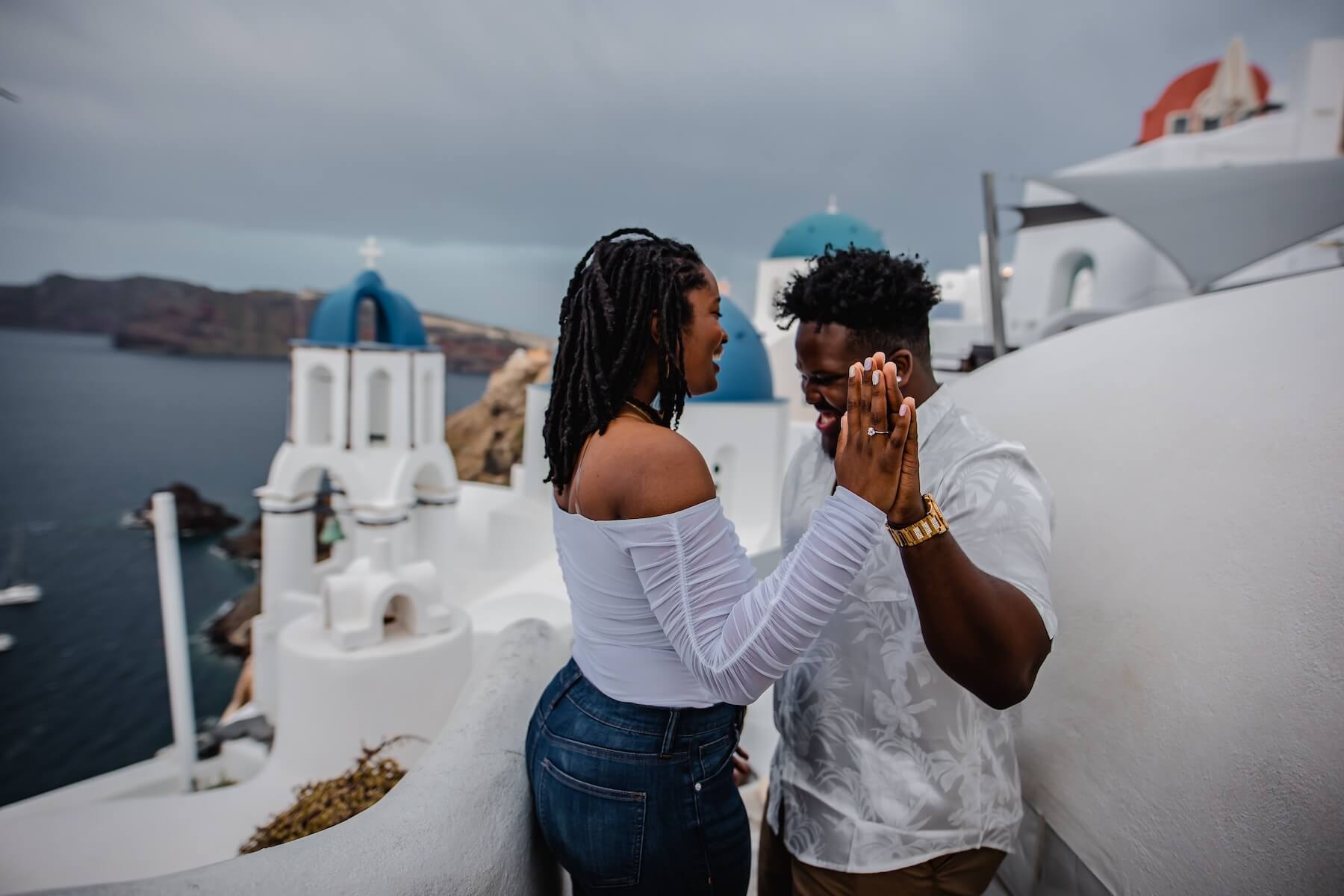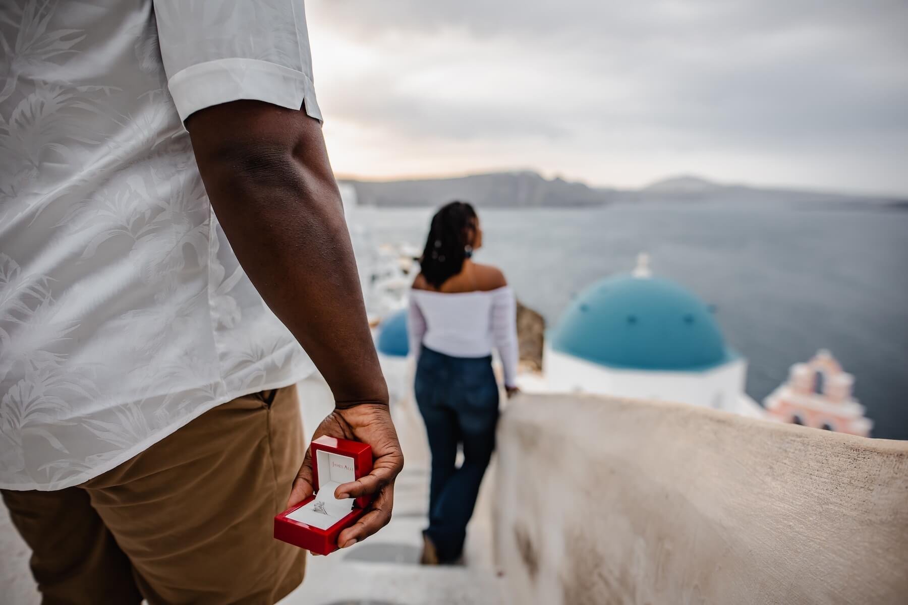 Photo: Gerald in Santorini for Flytographer. Jermaine and partner capture memories in Santorini with a proposal photoshoot in Oia Village.